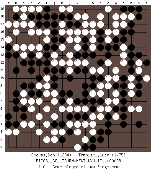 Last move : 1-0 2009 July 16 0:2:4 [Event "FICGS__GO__TOURNAMENT_KYU_II__000008"] [Site "FICGS"] [Date "2009.04.04"] [Round "1"] [Black "Groves,Don"] [White "Tampieri,Luca"] [Result "1-0"] [Rating 1 "1394"] [Rating 2 "1475"] 1.q15 d4 2.q4 d16 3.f3 h3 4.c6 e5 5.h4 g3 6.g4 f4 7.j3 f2 8.h2 g2 9.c9 q17 10.o17 p16 11.r17 r18 12.r16 m17 13.n15 o16 14.n16 n17 15.f5 e3 16.o18 n18 17.g6 j4 18.j5 k4 19.k5 l4 20.l5 m4 21.f17 c14 22.d18 c17 23.j17 l16 24.l14 r6 25.p6 r9 26.p9 q12 27.s18 p18 28.r19 q18 29.o14 k18 30.k17 l17 31.j18 l18 32.c12 e14 33.f12 f6 34.q10 r10 35.r11 s11 36.r12 s12 37.r13 m5 38.m6 n6 39.n7 l6 40.m7 g7 41.k7 h6 42.o3 k3 43.g14 c18 44.s4 s6 45.h8 g8 46.g9 f9 47.g10 f10 48.f11 k15 49.l15 k16 50.b4 b3 51.h15 k14 52.k13 c7 53.b7 c8 54.b8 d6 55.d8 d7 56.e8 f8 57.e10 j7 58.j8 k6 59.l7 j6 60.b13 b14 61.a14 a15 62.s13 b5 63.t12 t10 64.s8 r8 65.s9 p7 66.s10 p5 67.q5 o6 68.q6 o7 69.q7 p8 70.q8 n8 71.l9 o9 72.n10 o10 73.o11 n11 74.n12 m11 75.m9 p10 76.o5 n5 77.q9 o12 78.o13 p11 79.k11 l12 80.m2 l2 81.c5 c4 82.b6 k12 83.j12 q13 84.p15 j13 85.a13 b16 86.a4 a3 87.a5 c13 88.b11 j11 89.j10 h12 90.h11 j12 91.f18 o15 92.p14 m14 93.m13 m15 94.l13 f16 95.g16 j16 96.c19 d17 97.e17 e16 98.n14 h17 99.h18 h16 100.g17 h14 101.b18 b17 102.o4 a17 103.n3 e19 104.f13 d19 105.e18 b19 106.q16 p17 107.l11 m16 108.h7 g5 109.d13 e13 110.e12 m8 111.l8 n9 112.l1 k1 113.m1 m3 114.n2 j15 115.g15 g12 116.g11 j19 117.f19 h19 118.g18 g13 119.f14 e9 120.d9 e7 121.m10 d14 122.d11 q14 123.r14 c19 124.d12 f15 125.s19 o19 126.q19 1-0 Here are the names of the openings (joseki) played in the four corners : Corner d4 : d4 f3 Hoshi (Hwajeom, Seongjeom, Xingwei`) 4-4 Point. The star or hoshi (4-4) point, emphasizing influence at the potential expense of territory. Ikken Kakari (Hankan Keolch'im, Yi Gua`jiao~, 1-Space Low Approach). Black 2 is the standard approach move to the 4-4. Corner q16 : q15 q17 Takamoku (Gomok, Gaomu`) 5-4 Point. The takamoku (high) point (5-4). With its emphasis on influence, the 5-4 point complements the 4-4 (hoshi) point in creating an influence-oriented fuseki. Komoku. Black responds with 3-3, 3-5, 4-6, 4-7, 3-6, 3-7. Corner q4 : q4 l4 Hoshi (Hwajeom, Seongjeom, Xingwei`) 4-4 Point. The star or hoshi (4-4) point, emphasizing influence at the potential expense of territory. Corner d16 : d16 f17 Hoshi (Hwajeom, Seongjeom, Xingwei`) 4-4 Point. The star or hoshi (4-4) point, emphasizing influence at the potential expense of territory. Ikken Kakari (Hankan Keolch'im, Yi Gua`jiao~, 1-Space Low Approach). Black 2 is the standard approach move to the 4-4. Player Black won this Go (weiqi, baduk) game. Follow this game move after move (download)The comb formation is alive. (Anonymous) I teach you to lie, cheat and steal, and as soon as my back's turned you wait in line ? (Gregory House, House M.D.)