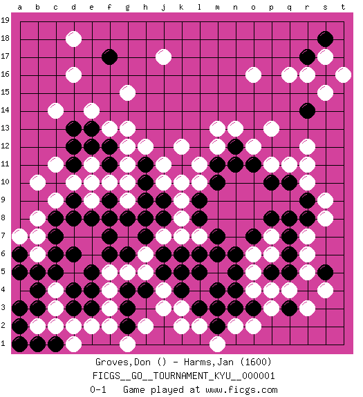 Last move : 0-1 2006 October 5 22:46:22 [Event "FICGS__GO__TOURNAMENT_KYU__000001"] [Site "FICGS"] [Date "2006.09.08"] [Round "1"] [Black "Groves,Don"] [White "Harms,Jan"] [Result "0-1"] [Rating 2 "1600"] 1.d4 q16 2.r4 d16 3.d6 p4 4.n4 r5 5.f17 c14 6.c10 d18 7.q10 j17 8.n6 q4 9.g4 c3 10.q3 r3 11.s5 s4 12.r14 o16 13.r17 r16 14.s16 s15 15.o3 s17 16.s18 t16 17.c5 e2 18.e3 f2 19.d3 d2 20.g2 f3 21.g3 f4 22.e5 g15 23.k4 s8 24.d12 r12 25.q7 r7 26.q6 p13 27.o11 m13 28.m11 k12 29.h11 k10 30.h9 f5 31.f6 g5 32.g6 h5 33.j6 j3 34.h4 j4 35.j5 h2 36.b3 b2 37.b4 k3 38.l3 l4 39.k5 l2 40.m3 g13 41.f12 f13 42.e13 e14 43.d13 g12 44.f11 k8 45.l9 k9 46.l8 l10 47.m10 h6 48.h7 j7 49.j8 k7 50.l5 l7 51.m7 g11 52.f9 g10 53.h10 f10 54.e10 g9 55.g8 e9 56.f8 e11 57.e12 d10 58.d11 c9 59.d8 b10 60.d9 e10 61.j9 c11 62.e8 h12 63.f7 r10 64.r9 r11 65.q8 s9 66.a2 p3 67.b1 c2 68.a3 q11 69.p10 n13 70.c1 d1 71.a1 g1 72.m2 b6 73.c8 b8 74.c7 b7 75.b5 o5 76.p5 o4 77.m6 o6 78.o7 o12 79.n12 m12 80.n11 p11 81.r8 r6 82.c6 p6 83.q5 p7 84.p8 o2 85.m4 k2 86.n5 n2 87.n3 m1 88.l6 l11 89.k6 j11 90.a6 a7 91.a5 j10 92.h8 c4 93.e4 pass 0-1 Here are the names of the openings (joseki) played in the four corners : Corner q4 : r4 p4 Komoku (Somok, Xiao~mu`) 3-4 Point. The komoku (3-4) point is the traditional corner enclosure move.. Ikken Takagakari (Hankan Nop'dakeolch'im, Yi Gaogua`jiao~, 1-Space High Approach). The 5-4 approach move has become more popular in modern times, as modern Go emphasizes speed and influence. Corner d16 : d16 f17 Hoshi (Hwajeom, Seongjeom, Xingwei`) 4-4 Point. The star or hoshi (4-4) point, emphasizing influence at the potential expense of territory. Ikken Kakari (Hankan Keolch'im, Yi Gua`jiao~, 1-Space Low Approach). Black 2 is the standard approach move to the 4-4. Corner q16 : q16 r14 Hoshi (Hwajeom, Seongjeom, Xingwei`) 4-4 Point. The star or hoshi (4-4) point, emphasizing influence at the potential expense of territory. Ikken Kakari (Hankan Keolch'im, Yi Gua`jiao~, 1-Space Low Approach). Black 2 is the standard approach move to the 4-4. Player White won this Go (weiqi, baduk) game. Follow this game move after move (download)Balance is not what players strike for, and if it does arise, it is in spite of them. (Pierre Audouard) The mind is like a parachute, it only functions when its open. (Unknown)