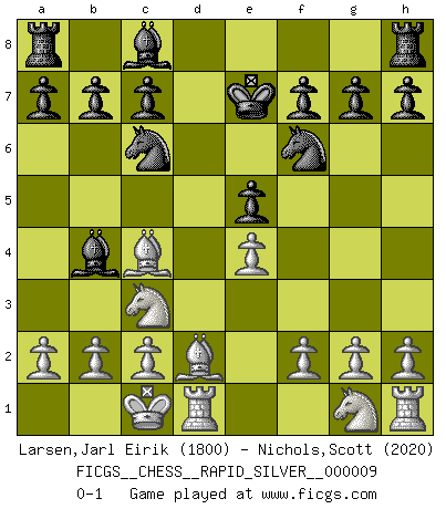 Last move : 0-1 2009 May 13 17:51:8 [Event "FICGS__CHESS__RAPID_SILVER__000009"] [Site "FICGS"] [Date "2009.04.04"] [Round "1"] [White "Larsen,Jarl Eirik"] [Black "Nichols,Scott"] [Result "0-1"] [WhiteElo "1800"] [BlackElo "2020"] 1.e4 d6 2.d4 Nf6 3.Nc3 e5 4.dxe5 dxe5 5.Qxd8+ Kxd8 6.Bc4 Bb4 7.Bd2 Ke7 8.O-O-O Nc6 0-1 This chess game has been lost on time (started : 2009.04.04 13:15:32) Pirc defense Queenside Castling by player White (move 8) Player Black won this chess game. Follow this game move after move (download)You need not play well - just help your opponent to play badly. (Genrikh Chepukaitis) Ich habe kein Problem mit Frauen, sondern nur mit dem Niveau ihres Schachspiels (Judith Polgar) Si el ingenio solamente fuese necesario para lucirse, las mujeres serían las mejores jugadoras de Ajedrez del mundo. (Albin) Le profane ne songe pas à la somme de jouissance dont il se prive, qui méconnaît ce jeu aux ressources aussi variées que passionnantes. (Jean-Marie Jeanton-Lamarche) Men never do evil so completely and cheerfully as when they do it from religious conviction. (Blaise Pascal)