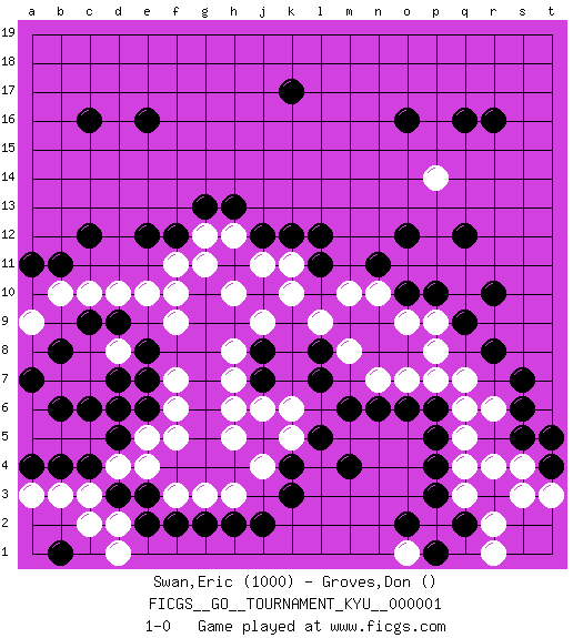 Last move : 1-0 2006 September 26 7:58:28 [Event "FICGS__GO__TOURNAMENT_KYU__000001"] [Site "FICGS"] [Date "2006.09.08"] [Round "1"] [Black "Swan,Eric"] [White "Groves,Don"] [Result "1-0"] [Rating 1 "1000"] 1.q16 d4 2.c16 r4 3.c6 d6 4.d7 c5 5.e6 e5 6.d5 b5 7.d6 f5 8.p3 r6 9.m4 k5 10.k3 h3 11.e16 d10 12.b6 a6 13.a7 a5 14.b8 f7 15.c12 d8 16.e8 f9 17.d9 e10 18.c9 c10 19.k17 b10 20.r10 f10 21.e12 p9 22.q12 p14 23.o12 q3 24.p4 p2 25.o16 q5 26.o2 r2 27.p1 o1 28.q2 r1 29.j2 h5 30.k12 k10 31.r16 j11 32.j12 g11 33.g13 h12 34.h13 g12 35.f12 f11 36.l11 m10 37.g2 f3 38.e2 d2 39.c4 c3 40.b4 c2 41.e3 e4 42.f2 g3 43.m6 m8 44.l7 k11 45.l12 h10 46.j7 j9 47.r8 h7 48.j8 h8 49.d3 h6 50.h2 j4 51.n11 l9 52.p6 n7 53.n6 p8 54.e7 f6 55.p10 o7 56.p5 q6 57.q9 p7 58.s7 q7 59.s5 s4 60.s6 q4 61.b11 n10 62.k4 a9 63.l5 j6 64.l8 k6 65.o10 o9 66.t4 t3 67.t5 s3 68.a11 b3 69.a4 a3 70.b1 d1 71.o6 1-0 Here are the names of the openings (joseki) played in the four corners : Corner d4 : d4 c6 Hoshi (Hwajeom, Seongjeom, Xingwei`) 4-4 Point. The star or hoshi (4-4) point, emphasizing influence at the potential expense of territory. Ikken Kakari (Hankan Keolch'im, Yi Gua`jiao~, 1-Space Low Approach). Black 2 is the standard approach move to the 4-4. Corner q4 : r4 p3 Komoku (Somok, Xiao~mu`) 3-4 Point. The komoku (3-4) point is the traditional corner enclosure move.. Ikken Kakari (Hankan Keolch'im, Yi Gua`jiao~, 1-Space Low Pincer). The small knight move is the basic approach move to the 3-4 point stone. It has been continually used for over four centuries. There are limitless variations, with new moves constantly being discovered. Black 2 opens the door to a treaure store of joseki. Player Black won this Go (weiqi, baduk) game. Follow this game move after move (download)There are possible things, impossible things, and things that happen. Sometimes things happen that were impossible. (Pierre Audouard) Programming can only do so much before it becomes too much. (Don Groves)