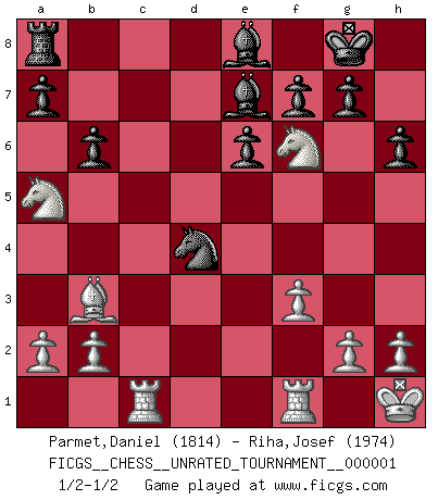 Last move : 1/2-1/2 2009 April 6 23:9:54 [Event "FICGS__CHESS__UNRATED_TOURNAMENT__000001"] [Site "FICGS"] [Date "2009.04.04"] [Round "1"] [White "Parmet,Daniel"] [Black "Riha,Josef"] [Result "1/2-1/2"] [WhiteElo "1814"] [BlackElo "1974"] 1.e4 d5 2.d4 c6 3.exd5 cxd5 4.c4 dxc4 5.Bxc4 Qc7 6.Bb3 Bg4 7.f3 Bd7 8.Ne2 Nf6 9.Bf4 Qb6 10.Nd2 e6 11.Rc1 Be7 12.O-O O-O 13.Nc4 Qa6 14.Nc3 Rd8 15.Qe1 Be8 16.Ne4 Rxd4 17.Be5 Nc6 18.Bxd4 Nxd4 19.Kh1 h6 20.Qa5 Qxa5 21.Nxa5 b6 22.Nxf6+ 1/2-1/2 Scandinavian (centre counter) defense Kingside Castling by player White (move 12) Kingside Castling by player Black (move 12) This chess game ended in a draw. Follow this game move after move (download)A man without frontiers. He didn't divide the East and the West, he brought them together in their admiration for him. (Ljubomir Ljubojevic, about Bobby Fischer's death) Privat ist Kortschnoi kein schlechter Mensch, sehr sympathisch. Aber während des Spiels ist er grausam. Er will dich töten. (Miguel Najdorf) Yo no creo en la psicología. Yo creo en las buenas movidas. (Bobby Fischer) Les échecs, c'est l'art d'analyser. (Mikhail Botvinnik) See no evil, hear no evil, speak no evil. (The 3 monkeys)