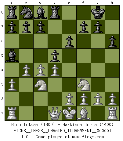 Last move : 1-0 2009 April 20 9:54:33 [Event "FICGS__CHESS__UNRATED_TOURNAMENT__000001"] [Site "FICGS"] [Date "2009.04.04"] [Round "1"] [White "Biro,Istvan"] [Black "Hakkinen,Jorma"] [Result "1-0"] [WhiteElo "1800"] [BlackElo "1400"] 1.d4 d5 2.c4 e6 3.Nf3 Nf6 4.Nc3 Bb4 5.Bg5 h6 6.Bxf6 O-O 7.Bxd8 Rxd8 8.a3 Ba5 9.b4 1-0 Queen's gambit declined Kingside Castling by player Black (move 6) Player White won this chess game. Follow this game move after move (download)A bad day of Chess is better than any good day at work. (Anonymous) Wir irren allesamt, nur jeder irrt anders. (Georg Christoph Lichtenberg) Los errores estan ahí, esperando a que se cometan. (Savielly Tartakower) Pour se monter efficace, un Cavalier a besoin d'avant-postes ! Les Cavaliers font les meilleurs bloqueurs de pions passés. Perception is reality. (Immanuel Kant)