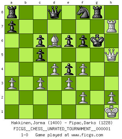 Last move : 1-0 2009 May 7 10:23:51 [Event "FICGS__CHESS__UNRATED_TOURNAMENT__000001"] [Site "FICGS"] [Date "2009.04.04"] [Round "1"] [White "Hakkinen,Jorma"] [Black "Pipac,Darko"] [Result "1-0"] [WhiteElo "1400"] [BlackElo "1228"] 1.d4 d5 2.c4 c6 3.Nf3 Bg4 4.Nc3 Bxf3 5.gxf3 e6 6.Bf4 Bb4 7.c5 h6 8.e3 Nf6 9.Bd3 Nbd7 10.O-O O-O 11.a3 Bxc3 12.bxc3 Nh5 13.Bd6 Re8 14.f4 Nhf6 15.Kh1 Ne4 16.Bxe4 dxe4 17.Rg1 b6 18.Qg4 g6 19.Qh3 Kh7 20.Rg5 bxc5 21.Rag1 Rg8 22.R1g4 f6 23.Rh4 Nf8 24.Rxh6+ Kg7 25.R5xg6+ Kf7 26.Rh7+ Kxg6 27.Qh5+ 1-0 QGD Slav : 3.Nf3 Kingside Castling by player White (move 10) Kingside Castling by player Black (move 10) Player White won this chess game. Follow this game move after move (download)Chess is a foolish expedient for making idle people believe they are doing something very clever when they are only wasting their time. (George Bernard Shaw) Später, ... hatte ich zunehmend Erfolg in entscheidenden Partien. Vielleicht weil ich eine einfache Wahrheit erkannte: nicht nur ich hatte Angst, auch mein Gegner. (Mikhail Nekhemyevich Tal) Tu puedes aprender mucho mas de una partida que pierdas que de una partida ganada. Tendras que perder cientos de partidas antes de llegar a ser un buen jugador. (Jose Raul Capablanca) Assurément je connaissais par expérience le mystérieux attrait de ce jeu royal, le seul entre tous les jeux inventés par les hommes qui échappe souverainement à la tyrannie du hasard, le seul où l'on ne doive sa victoire qu'à son intelligence ou plutôt à une certaine forme d'intelligence. Mais n'est-ce pas déjà le limiter injurieusement que d'appeler les échecs un jeu ? N'est-ce pas une science, un art ou quelque chose qui, comme le cercueil de Mahomet entre ciel et terre, est suspendu entre l'un et l'autre, et qui réunit un nombre incroyable de contraires ? [...] C'est une pensée qui ne mène à rien, une mathématique qui n'établit rien, un art qui ne laisse pas d'uvre, une architecture sans matière; et il l'a prouvé néanmoins qu'il était plus durable, à sa manière, que les livres ou que tout autre monument, ce jeu unique qui appartient à tous les peuples et à tous les temps, et dont personne ne sait quel dieu en fit don à la terre pour tuer l'ennui, pour aiguiser l'esprit et stimuler l'âme. Où commence-t-il, où finit-il ? (Stefan Zweig) Good luck. You're gonna need it. (Han Solo in Star Wars ep.6)