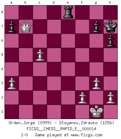 Last move : 1-0 2009 April 15 16:27:8 [Event "FICGS__CHESS__RAPID_E__000014"] [Site "FICGS"] [Date "2009.04.04"] [Round "1"] [White "Orden,Jorge"] [Black "Stoyanov,Zdravko"] [Result "1-0"] [WhiteElo "0999"] [BlackElo "1256"] 1.e4 c5 2.Nf3 Nc6 3.d4 d6 4.d5 Ne5 5.Bb5+ Bd7 6.Bxd7+ Nxd7 7.O-O h6 8.Bf4 Ngf6 9.c4 Nxe4 10.Nbd2 Nxd2 11.Qxd2 Nb6 12.Qe2 Nd7 13.a3 Qb6 14.Rab1 O-O-O 15.Qd2 e5 16.Bg3 Qb3 17.Qe3 Qxc4 18.Rfd1 Nb6 19.Rbc1 Qa2 20.b4 Nxd5 21.Qe4 Nf6 22.Qf5+ Kc7 23.Nxe5 dxe5 24.Qxe5+ Bd6 25.Rxd6 Nd7 26.Rxd7+ Kxd7 27.Qd6+ Ke8 28.Re1+ Qe6 29.Rxe6+ fxe6 30.Qxe6+ Kf8 31.Bd6+ Rxd6 32.Qxd6+ Kg8 33.bxc5 Kh7 34.Qd7 Rf8 35.Qxb7 Re8 36.g3 1-0 Sicilian defense Kingside Castling by player White (move 7) Queenside Castling by player Black (move 14) Player White won this chess game. Follow this game move after move (download)There are tough players and nice guys, and I'm a tough player. (Bobby Fischer) Jeder leidlich begabte Spieler, er braucht keineswegs hervorragend veranlagt zu sein, kann es zum Meister bringen. Aber das ist ja auch gar nicht nötig! Der richtige Standpunkt ist es, zu seinem Vergnügen zu spielen, und man glaube ja nicht, dass der Genuss proportional dem Können sei. (Siegbert Tarrasch) ¿Que sería del Ajedrez sin errores graciosos?. (Kurt Richter) On entre au jeu d'Echecs comme on entre en Religion. Pour le joueur d'Echecs, la partie d'Echecs c'est l'office, la messe, le défilé du 1er Mai, le dépôt de gerbe au Monument aux Morts. C'est un drame sacré. (Michel Roos) Home computers are being called upon to perform many new functions, including the consumption of homework formerly eaten by the dog. (Doug Larson)