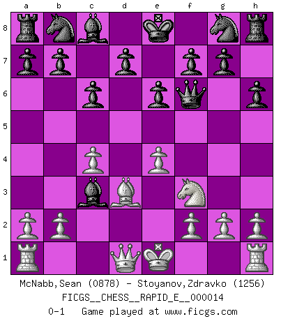 Last move : 0-1 2009 April 9 11:23:5 [Event "FICGS__CHESS__RAPID_E__000014"] [Site "FICGS"] [Date "2009.04.04"] [Round "1"] [White "McNabb,Sean"] [Black "Stoyanov,Zdravko"] [Result "0-1"] [WhiteElo "0878"] [BlackElo "1256"] 1.d4 c6 2.c4 h6 3.Nc3 e6 4.e4 Bb4 5.Bd3 Bxc3+ 6.Bd2 Bxd4 7.Bc3 Qf6 8.Nf3 Bxc3+ 0-1 Queen's pawn Player Black won this chess game. Follow this game move after move (download)For surely of all the drugs in the world, Chess must be the most permanently pleasurable. (Assiac) Schach wird sich dank seiner hohen kulturellen Tradition immer durchsetzen. In näherer Zukunft womöglich sogar als Gegenreaktion auf die maßlose Reizüberflutung im Freizeit- und Spielbereich. (Garry Kasparov) El Ajedrez se juega con la mente... ¡no con las manos!. (Renaud y Kahn) La conception d'un plan est le processus par lequel un joueur exploite les avantages de sa position tout en s'efforçant d'en réduire au minimum les inconvénients. Afin de garantir le succès, un plan doit toujours se fonder sur un diagnostic objectif des particularités d'une position. La conception d'un plan est d'autant plus difficile que la position est équilibrée, et grandement facilitée lorsqu'il n'existe qu'un seul plan susceptible de répondre aux exigences de la position. (Harry Golombek) Don't anthropomorphize computers - they hate it. (Anonymous)