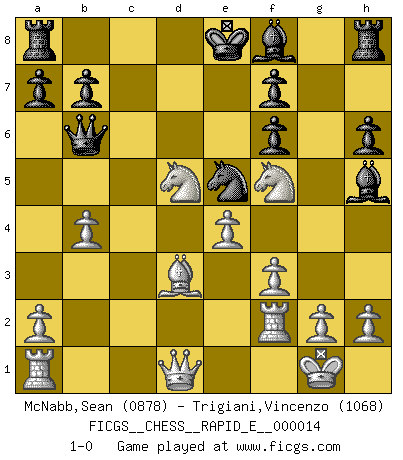 Last move : 1-0 2009 May 30 6:51:26 [Event "FICGS__CHESS__RAPID_E__000014"] [Site "FICGS"] [Date "2009.04.04"] [Round "1"] [White "McNabb,Sean"] [Black "Trigiani,Vincenzo"] [Result "1-0"] [WhiteElo "0878"] [BlackElo "1068"] 1.d4 e6 2.c4 d6 3.Nc3 Nf6 4.Bg5 h6 5.Bxf6 gxf6 6.e4 c6 7.Nf3 e5 8.Bd3 exd4 9.Nxd4 Nd7 10.O-O Ne5 11.b4 Bg4 12.f3 Bh5 13.Nf5 d5 14.cxd5 Qb6+ 15.Rf2 cxd5 16.Nxd5 1-0 This chess game has been lost on time (started : 2009.04.04 17:39:15) Queen's pawn Kingside Castling by player White (move 10) Player White won this chess game. Follow this game move after move (download)Chess is mental torture. (Garry Kasparov) Wer mein Gambit spielt, muß bereit sein, alle Brücken hinter sich abzubrechen. Es verändert den ganzen Menschen. Es wirkt wie ein Zauberstab und fördert verkümmerte, gute Charakter- eigenschaften wieder zu Tage. (Emil Joseph Diemer) A la fecha, Fischer esta simplemente un nivel arriba de todos los mejores jugadores de Ajedrez del mundo. (John Jacobs) Aux échecs, les retours au sommet sont rares : les dommages psychologiques consécutifs à une défaite sont trop sévères. (Daily Telegraph) Memory is a crazy woman that hoards colored rags and throws away food. (Austin O'Malley)