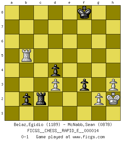 Last move : 0-1 2009 May 16 18:23:56 [Event "FICGS__CHESS__RAPID_E__000014"] [Site "FICGS"] [Date "2009.04.04"] [Round "1"] [White "Belaz,Egidio"] [Black "McNabb,Sean"] [Result "0-1"] [WhiteElo "1189"] [BlackElo "0878"] 1.e4 c5 2.Bc4 e6 3.Nf3 Nc6 4.O-O Nf6 5.d3 Be7 6.Nc3 O-O 7.a4 d5 8.exd5 exd5 9.Ba2 Bg4 10.Qe2 d4 11.h3 Bxf3 12.Qxf3 Qd6 13.Nb5 Qe5 14.Bf4 Qh5 15.Qxh5 Nxh5 16.Bd2 a6 17.Nc7 Rac8 18.Nd5 Bd6 19.Nb6 Rcd8 20.Bg5 Be7 21.Bxe7 Nxe7 22.Rfe1 Nc6 23.Nc4 Nf4 24.Re4 Nd5 25.Rae1 Ncb4 26.Bb1 h6 27.Nd2 f5 28.R4e2 g5 29.Nc4 b5 30.axb5 axb5 31.Na5 Nf4 32.Re7 Nbd5 33.Nc6 Nxe7 34.Nxd8 Rxd8 35.Rxe7 Nd5 36.Ba2 Kf8 37.Rh7 f4 38.Rxh6 Nb4 39.Bb1 Re8 40.c3 Re1+ 41.Kh2 Rxb1 42.cxb4 cxb4 43.Rb6 Rxb2 44.Rxb5 Rxf2 45.Rxg5 b3 46.Rb5 b2 47.Kg1 Rc2 48.Kh2 f3 0-1 Sicilian defense Kingside Castling by player White (move 4) Kingside Castling by player Black (move 6) 10 pieces endgame at move 45 : White KRPPP , Black KRPPP WHITE : King + 1 Rook 3 Pawns BLACK : King + 1 Rook 3 Pawns Player Black won this chess game. Follow this game move after move (download)First-class players lose to second class players because second-class players sometimes play a first-class game. (Tarrasch) Ich bewundere Kasparows phantasievolle Angriffssiege aus den Achtzigern und Neunzigern, aber wenn man sie mit dem Computer überprüft, nimmt der Computer in jeder zweiten Partie die Opfer an, verteidigt sich und gewinnt. (Vladimir Kramnik) Las ideas audaces son como las piezas del Ajedrez que avanzan hacia adelante. Ellas pueden ser vencidas, pero también pueden iniciar una partida victoriosa. (Goethe) Il a essayé de se convaincre qu'il pourrait empêcher toutes les erreurs et ne jamais perdre. L'horreur ! Gary Kasparov au sujet de Robert Fischer. There is far too much law for those who can afford it and far too little for those who cannot. (Derek Bok)