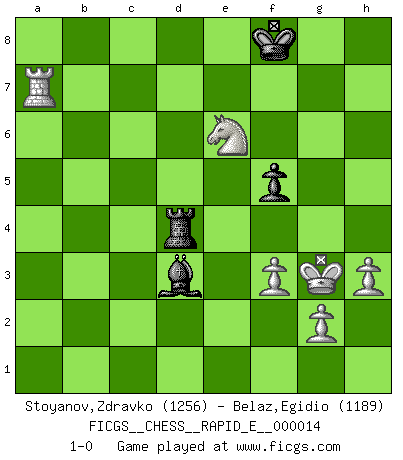 Last move : 1-0 2009 May 3 16:48:18 [Event "FICGS__CHESS__RAPID_E__000014"] [Site "FICGS"] [Date "2009.04.04"] [Round "1"] [White "Stoyanov,Zdravko"] [Black "Belaz,Egidio"] [Result "1-0"] [WhiteElo "1256"] [BlackElo "1189"] 1.e4 c5 2.Nf3 d6 3.h3 Nc6 4.Bb5 Bd7 5.Bxc6 Bxc6 6.d3 Nf6 7.Bg5 g6 8.Bxf6 exf6 9.O-O Bg7 10.Nbd2 O-O 11.Re1 Qb6 12.Nc4 Qc7 13.c3 b5 14.Ncd2 Rfe8 15.d4 cxd4 16.cxd4 d5 17.exd5 Bxd5 18.Rxe8+ Rxe8 19.b3 f5 20.Rc1 Qa5 21.Qc2 h5 22.a4 bxa4 23.bxa4 Bh6 24.Rd1 Bxd2 25.Nxd2 Re2 26.Qd3 Re6 27.Qb5 Qxb5 28.axb5 Rb6 29.Ra1 Rxb5 30.Rxa7 Be6 31.Nf3 Bd5 32.Ne5 Rb4 33.Kh2 f6 34.Nxg6 Bf7 35.Ne7+ Kf8 36.Nxf5 Bb3 37.Kg3 Bc2 38.Ng7 Be4 39.Nxh5 f5 40.f3 Bd3 41.Nf4 Rxd4 42.Ne6+ 1-0 Sicilian Kingside Castling by player White (move 9) Kingside Castling by player Black (move 10) 10 pieces endgame at move 41 : White KRNPPP , Black KRBP WHITE : King + 1 Rook 1 Knight 3 Pawns BLACK : King + 1 Rook 1 Bishop 1 Pawn Player White won this chess game. Follow this game move after move (download)I don't believe in psychology. I believe in good moves. (Bobby Fischer) Ich suche im Schach immer etwas Eigenes. Riskantes Spiel im Stile schachlicher Musketiere ist nicht meine Sache, auch wenn es vielen Freunden scharfer Wendungen gefällt. (Anatoly Karpov) ¿Que sería del Ajedrez sin errores graciosos?. (Kurt Richter) Donnez-moi un Cavalier en 6e et je gagnerais toutes mes parties. (Steinitz) Never was anything great achieved without danger. (Niccolo Machiavelli)