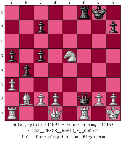 Last move : 1-0 2009 April 25 1:6:14 [Event "FICGS__CHESS__RAPID_E__000014"] [Site "FICGS"] [Date "2009.04.04"] [Round "1"] [White "Belaz,Egidio"] [Black "Frame,Jeremy"] [Result "1-0"] [WhiteElo "1189"] [BlackElo "1115"] 1.e4 e5 2.f4 Bc5 3.Nf3 d6 4.Bc4 f5 5.Nc3 Nf6 6.a3 Nc6 7.b4 Be6 8.Bxe6 Qe7 9.Bxf5 O-O 10.bxc5 dxc5 11.fxe5 Rad8 12.exf6 Qf7 13.fxg7 Kxg7 14.O-O Ne7 15.Bb2 Nxf5 16.exf5 Qxf5 17.Ne4 Kg8 18.Neg5 b5 19.Re1 b4 20.Ne6 Rde8 21.Nxf8 Rxf8 22.Ne5 Qf2+ 23.Kh1 a5 24.Rf1 1-0 KGD : Classical variation Kingside Castling by player Black (move 9) Kingside Castling by player White (move 14) Player White won this chess game. Follow this game move after move (download)Chess is not like life... it has rules ! (Mark Pasternak) Capablanka war das größte Genie der Schachgeschichte! Aber denken sie nicht er habe nichts vom Schach verstanden. Er wusste nur soviel wie er wissen musste um seine Ziele zu erreichen. (Mikhail Moiseyevich Botvinik) El Ajedrez es sobre todo, ¡una pelea!. (Emanuel Lasker) Psychologiquement, tu dois avoir confiance en toi même, mais cette confiance doit être basée sur des faits. (Robert Fischer) Perhaps the current trend of many chess professionals taking up the more lucrative pastime of poker is not a wholly negative one. It may not be too late for humans to relearn how to take risks in order to innovate and thereby maintain the advanced lifestyles we enjoy. And if it takes a poker-playing supercomputer to remind us that we can't enjoy the rewards without taking the risks, so be it. (The Chess Master and the Computer, by Garry Kasparov - 2010)