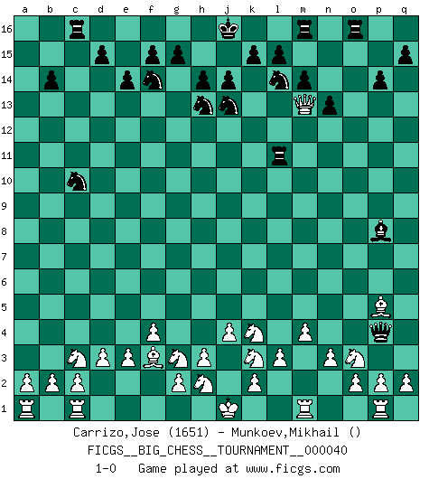 Last move : 1-0 2009 May 30 14:56:50 [Event "FICGS__BIG_CHESS__TOURNAMENT__000040"] [Site "FICGS"] [Date "2009.04.07"] [Round "1"] [White "Carrizo,Jose"] [Black "Munkoev,Mikhail"] [Result "1-0"] [WhiteElo "1651"] [BlackElo ""] 1.j2-k4 p15-p14 2.h1-o7 g16-f14 3.o7-o15 o16-q14 4.o15-f7 e15-e14 5.f7-c7 h15-j13 6.c7-c15 p16-o14 7.d2-d3 q14-c1 8.e1-c1 j15-h13 9.p1-o3 h16-n11 10.e2-e3 b16-c14 11.c15-n5 n11-j11 12.m2-m4 f16-b12 13.l1-p5 j11-j10 14.g1-j2 k16-l14 15.n2-n3 m15-m14 16.b1-c3 n15-n13 17.f2-f4 q16-o16 18.f1-e2 b15-b14 19.e2-f3 l16-q11 20.l2-l3 c16-b15 21.o1-m3 a16-c16 22.h2-k3 o14-m13 23.k1-h2 c14-d12 24.m3-n4 b15-n4 25.n5-n4 c16-c11 26.j3-j4 c11-n11 27.n4-m3 e16-c16 28.m3-l4 j10-p4 29.q1-p1 n11-l11 30.l4-p8 q11-o9 31.p8-a8 d12-c10 32.a8-a15 b12-c13 33.a15-a7 o9-p8 34.a7-f7 c13-k6 35.f7-m13 k6-g3 36.j2-g3 1-0 Follow this game move after move (download)To avoid losing a piece, many a person has lost the game. (Savielly Tartakover) Schach ist das schnellste Spiel der Welt, weil man in jeder Sekunde Tausende von Gedanken ordnen muß. (Albert Einstein) El Ajedrez es tortura mental. (Garry Kasparov) Si le désir cupide (et stupide) de gagner est une inépuisable source de souffrance, une combinaison brillante sur l'échiquier est une découverte : le coquelicot qui s'épanouit lorsque apparaît la Voie Lactée. (Arrabal) Employ the attack like tactic of defense. (Chinese proverb)