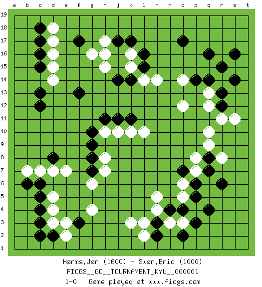 Last move : 1-0 2006 December 15 18:34:45 [Event "FICGS__GO__TOURNAMENT_KYU__000001"] [Site "FICGS"] [Date "2006.09.08"] [Round "1"] [Black "Harms,Jan"] [White "Swan,Eric"] [Result "1-0"] [Rating 1 "1600"] [Rating 2 "1000"] 1.q16 d4 2.q4 d16 3.f3 k3 4.m3 g4 5.c3 d3 6.c4 d5 7.d2 e2 8.c2 e3 9.c6 e7 10.f17 h17 11.c17 d17 12.c16 d15 13.c15 d18 14.c13 d14 15.c12 r14 16.o17 q10 17.k17 g16 18.r6 o3 19.o4 n3 20.n4 l3 21.m2 m4 22.p3 l2 23.o2 m5 24.s16 r8 25.r12 q12 26.r13 q13 27.s14 r11 28.r15 s11 29.q14 o14 30.p14 o12 31.d8 c7 32.c5 d7 33.k14 k16 34.l16 k15 35.l15 l14 36.j14 h15 37.f13 b7 38.b6 m14 39.j17 h16 40.h11 j10 41.g9 h10 42.g10 h8 43.g8 h7 44.g7 g6 45.j11 k10 46.o7 o5 47.p5 o6 48.p6 p7 49.q7 p8 50.q8 q9 51.k11 l10 52.c18 1-0 This go game has been lost on time (started : 2006.09.08 3:5:56) Here are the names of the openings (joseki) played in the four corners : Corner d4 : d4 f3 Hoshi (Hwajeom, Seongjeom, Xingwei`) 4-4 Point. The star or hoshi (4-4) point, emphasizing influence at the potential expense of territory. Ikken Kakari (Hankan Keolch'im, Yi Gua`jiao~, 1-Space Low Approach). Black 2 is the standard approach move to the 4-4. Corner d16 : d16 f17 Hoshi (Hwajeom, Seongjeom, Xingwei`) 4-4 Point. The star or hoshi (4-4) point, emphasizing influence at the potential expense of territory. Ikken Kakari (Hankan Keolch'im, Yi Gua`jiao~, 1-Space Low Approach). Black 2 is the standard approach move to the 4-4. Corner q16 : q16 r14 Hoshi (Hwajeom, Seongjeom, Xingwei`) 4-4 Point. The star or hoshi (4-4) point, emphasizing influence at the potential expense of territory. Ikken Kakari (Hankan Keolch'im, Yi Gua`jiao~, 1-Space Low Approach). White 2 is the standard approach move to the 4-4. Player Black won this Go (weiqi, baduk) game. Follow this game move after move (download)Grab the border points between two moyos. (Anonymous) The arrogant army will lose certainly the battle. (Chinese proverb)