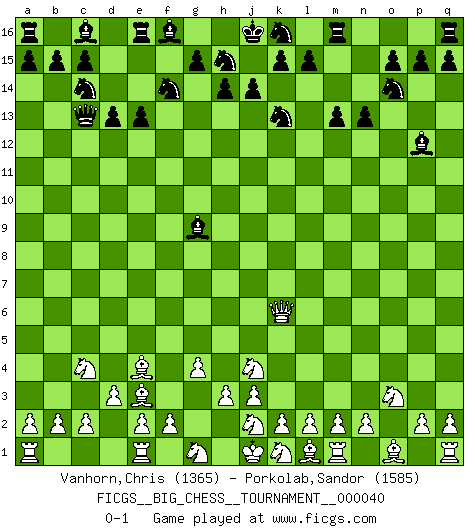 Last move : 0-1 2009 May 4 15:6:58 [Event "FICGS__BIG_CHESS__TOURNAMENT__000040"] [Site "FICGS"] [Date "2009.04.07"] [Round "1"] [White "Vanhorn,Chris"] [Black "Porkolab,Sandor"] [Result "0-1"] [WhiteElo "1365"] [BlackElo "1585"] 1.g2-g4 j15-k13 2.d2-d3 h16-o10 3.c1-e3 o10-o2 4.p1-o3 o2-c13 5.b1-a3 n15-n13 6.a3-c4 p16-o14 7.h1-f3 e15-e13 8.h2-j4 b16-c14 9.f3-f15 g16-f14 10.f15-j12 m15-m13 11.f1-g2 d15-d13 12.j12-p6 l16-p12 13.g2-e4 o16-j11 14.p6-k6 j11-g9 0-1 Follow this game move after move (download)Not only will I predict his triumph over Botvinnik, but I'll go further and say that he'll probably be the greatest Chess player that ever lived. (John Collins) Das typische an einem Großmeister ist, daß er eine gewonnene Position schnell und schmerzlos gewinnt. (Irving Chernev) El Ajedrez era la lengua materna de Capablanca. (Reti) Que feriez-vous si vous étiez en train de jouer aux échecs et que la fin du monde arrive ? Je continuerais à jouer. (Saint Borromée) Coffee just isn't my cup of tea. (Unknown)