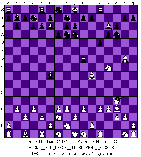 Last move : 1-0 2009 June 30 21:17:30 [Event "FICGS__BIG_CHESS__TOURNAMENT__000040"] [Site "FICGS"] [Date "2009.04.07"] [Round "1"] [White "Jerez,Miriam"] [Black "Parwicz,Witold"] [Result "1-0"] [WhiteElo "1451"] [BlackElo ""] 1.n2-n3 o15-o14 2.j2-k4 g15-g13 3.c2-c3 f16-g15 4.g2-g4 j15-h13 5.h1-l4 h16-k14 6.p2-p3 n15-n13 7.o1-q3 m15-m13 8.d2-d4 b15-b14 9.l4-k3 c16-b15 10.o2-o3 e15-e14 11.k4-j6 k14-o10 12.h3-h4 m16-m14 13.n3-n4 m14-k14 14.k3-l3 k16-l14 15.l3-j5 o10-q8 16.m2-m4 m13-m12 17.l1-o4 d15-d14 18.j5-n5 q8-l8 19.q3-l8 g15-e13 20.n5-o5 e13-f14 21.b1-d2 p16-q14 22.k2-k4 b16-d15 23.d2-e4 l16-n14 24.e2-e3 o16-j11 25.b2-b4 l14-j13 26.f1-p10 q16-m16 27.j6-k8 q14-o13 28.k8-l10 j11-f8 29.e4-g3 k14-k10 30.l10-n9 1-0 This big chess game has been lost on time (started : 2009.04.07 17:52:57) Follow this game move after move (download)That's what Chess is all about. One day you give your opponent a lesson, the next day he gives you one. (Bobby Fischer) Schach ist Krieg, im Schach geht es um testosterongesteuerte Urschreie. (Garry Kasparov) En el Ajedrez, cuando menos, el valiente hereda la tierra. (Edmar Mednis) Il a essayé de se convaincre qu'il pourrait empêcher toutes les erreurs et ne jamais perdre. L'horreur ! Gary Kasparov au sujet de Robert Fischer. Warrior pose battles inner weakness and wins focus. You see that there is no war within you. You're on your own side, and you are your own strength. (Terri Guillemets)