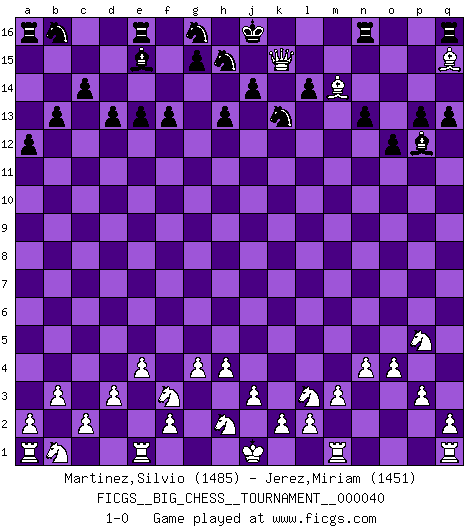 Last move : 1-0 2009 May 23 22:57:16 [Event "FICGS__BIG_CHESS__TOURNAMENT__000040"] [Site "FICGS"] [Date "2009.04.07"] [Round "1"] [White "Martinez,Silvio"] [Black "Jerez,Miriam"] [Result "1-0"] [WhiteElo "1485"] [BlackElo "1451"] 1.k1-l3 d15-d14 2.p2-p3 k16-l14 3.j2-k4 n15-n14 4.g2-g4 f15-f14 5.n2-n4 o15-o13 6.m2-m3 j15-h13 7.e2-e3 h16-n11 8.h1-m5 c15-c14 9.o1-q3 c16-q3 10.p1-q3 b15-b13 11.l1-p5 a15-a13 12.h3-h4 a13-a12 13.f1-k5 o16-j11 14.p5-j11 h13-j11 15.d2-d3 n11-m12 16.m5-m12 n14-n13 17.m12-l11 j11-k13 18.l11-l8 m15-m14 19.g1-f3 e15-e13 20.e3-e4 l14-k12 21.b2-b3 o13-o12 22.q3-p5 q15-q13 23.o2-o4 p16-o14 24.c1-a3 o14-m13 25.k4-l6 l16-p12 26.l8-m8 d14-d13 27.l6-k8 f16-e15 28.k5-n8 h14-h13 29.k8-l10 k12-l10 30.n8-l10 f14-f13 31.m8-m13 l15-l14 32.m13-o15 p15-p13 33.o15-o14 q16-p16 34.l10-q15 p16-o16 35.o14-n15 o16-q16 36.a3-m14 m16-n16 37.n15-k15 1-0 Follow this game move after move (download)Alekhine is a poet who creates a work of art out of something that would hardly inspire another man to send home a picture post card. (Max Euwe) Wenn ich mich einlogge, glauben die Leute gewöhnlich nicht, dass ich es selbst bin und sie fangen an, mir dumme Fragen zu stellen. Und wenn sie es glauben, stellen sie wieder andere dumme Fragen. (Judith Polgar) Creo que una cierta cantidad de temperamento es esperada de los genios del Ajedrez. (Ron Gross) Le profane ne songe pas à la somme de jouissance dont il se prive, qui méconnaît ce jeu aux ressources aussi variées que passionnantes. (Jean-Marie Jeanton-Lamarche) Always be a first-rate version of yourself, instead of a second-rate version of somebody else. (Judy Garland)