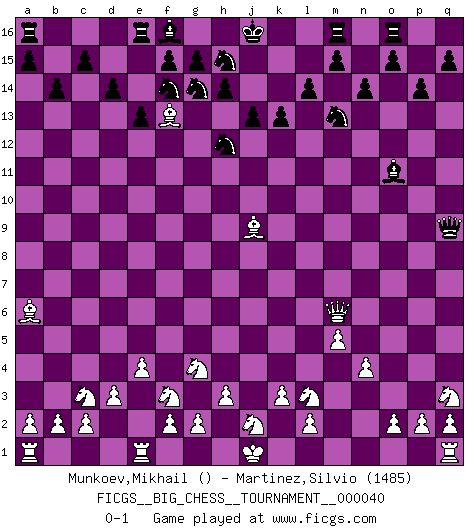 Last move : 0-1 2009 July 20 11:7:55 [Event "FICGS__BIG_CHESS__TOURNAMENT__000040"] [Site "FICGS"] [Date "2009.04.07"] [Round "1"] [White "Munkoev,Mikhail"] [Black "Martinez,Silvio"] [Result "0-1"] [WhiteElo ""] [BlackElo "1485"] 1.e2-e4 g16-f14 2.f1-c4 n15-n14 3.m2-m4 j15-k13 4.l1-o4 d15-d14 5.d2-d3 c16-n6 6.k2-k3 h16-q8 7.o4-n5 q8-j8 8.p1-o3 p15-p14 9.c1-p13 o16-n15 10.p13-n15 p16-n15 11.b1-c3 b16-c14 12.k1-l3 j8-j3 13.m4-m5 n6-q9 14.h2-g4 j3-j12 15.n2-n4 j14-j13 16.c4-b5 j12-h12 17.b5-k13 l15-l14 18.k13-b5 k15-k13 19.h1-h2 l16-g12 20.h2-p9 h12-q12 21.o1-d11 c14-e13 22.d11-b9 e13-g14 23.o3-p5 q9-o11 24.g1-f3 e15-e13 25.n5-j9 q16-o16 26.m1-m3 q12-q9 27.p9-m6 n15-m13 28.m3-q3 g12-q3 29.p5-q3 b15-b14 30.b9-f13 k16-j14 31.b5-a6 j14-h12 0-1 This big chess game has been lost on time (started : 2009.04.07 17:52:57) Follow this game move after move (download)In Chess, just as in life, today's bliss may be tomorrow's poison. (Assaic) Es gibt keine einzige Frau, der ich nicht einen Springer vorgeben könnte und trotzdem gewänne. (Robert James Fischer) El Ajedrez es la vida. (Bobby Fischer) Même un GMI sait rarement calculer sur plus de cinq coups une attaque à sacrifices. (Rudolf Spielmann) For a mechanic, you seem to do an excessive amount of thinking. (C-3PO in Star Wars ep.2)
