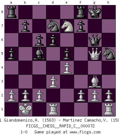 Last move : 1-0 2009 May 14 20:48:33 [Event "FICGS__CHESS__RAPID_C__000072"] [Site "FICGS"] [Date "2009.04.07"] [Round "1"] [White "Di Giandomenico,Alfonso"] [Black "Martinez Camacho,Victor Hugo"] [Result "1-0"] [WhiteElo "1563"] [BlackElo "1507"] 1.e4 e5 2.Bc4 Nf6 3.d3 Bc5 4.Nf3 d6 5.Bg5 Nbd7 6.Nc3 h6 7.Bh4 O-O 8.Nd5 c6 9.Ne3 g5 10.Bg3 Nh5 11.Qd2 Nb6 12.Bb3 Qf6 13.O-O-O Be6 14.Bxe6 Qxe6 15.Kb1 a5 16.Nf5 Nd7 17.Nxg5 hxg5 18.Qxg5+ Qg6 19.Ne7+ 1-0 Bishop's Opening : Berlin defense Kingside Castling by player Black (move 7) Queenside Castling by player White (move 13) Player White won this chess game. Follow this game move after move (download)On the chessboard, lies and hypocrisy do not survive long. (Emanuel Lasker) Wer mein Gambit spielt, muß bereit sein, alle Brücken hinter sich abzubrechen. Es verändert den ganzen Menschen. Es wirkt wie ein Zauberstab und fördert verkümmerte, gute Charakter- eigenschaften wieder zu Tage. (Emil Joseph Diemer) Yo siempre he tenido un ligero sentimiento de lástima por una persona que no tiene conocimiento del Ajedrez. (Siegbert Tarrasch) Je crois qu'il existe des manières très spécifiques de jouer efficacement contre une machine. Evidemment, nous n'avons aucune chance en technique pure, parce que l'ordinateur calcule de manière parfaite. Mais lorsque nous faisons appel à notre cerveau, en utilisant l'intuition et la compréhension, alors nous restons beaucoup plus forts. (Anatoli Karpov) A clear conscience is usually the sign of a bad memory. (Unknown)