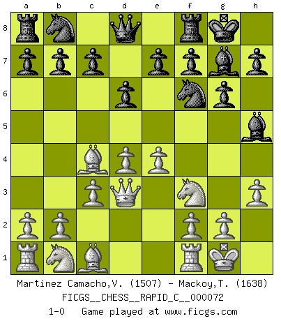 Last move : 1-0 2009 May 28 6:46:45 [Event "FICGS__CHESS__RAPID_C__000072"] [Site "FICGS"] [Date "2009.04.07"] [Round "1"] [White "Martinez Camacho,Victor Hugo"] [Black "Mackoy,Travis"] [Result "1-0"] [WhiteElo "1507"] [BlackElo "1638"] 1.e4 g6 2.d4 Bg7 3.Nf3 d6 4.Bc4 Nf6 5.c3 O-O 6.O-O Bg4 7.h3 Bh5 8.Qd3 1-0 This chess game has been lost on time (started : 2009.04.07 19:22:41) Robatsch (Modern) defense Kingside Castling by player Black (move 5) Kingside Castling by player White (move 6) Player White won this chess game. Follow this game move after move (download)I'm not a materialistic person, in that, I don't suffer the lack or loss of money. The absence of worldly goods I don't look back on. For Chess is a way I can be as materialistic as I want without having to sell my soul. (Jamie Walter Adams) Wenn ich einen Club besuche, sind die Spieler stumm vor Staunen. (José Raúl Capablanca) El Ajedrez es una hermosa aventura. (Bent Larsen) Des points faibles ou des trous dans la position de l'adversaire doivent être occupés par des pièces et non pas par des pions. (Siegbert Tarrasch) The existence of forgetting has never been proved: We only know that some things don't come to mind when we want them. (Friedrich Nietzsche)