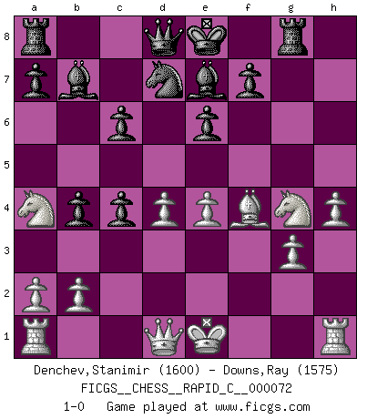 Last move : 1-0 2009 June 17 20:21:17 [Event "FICGS__CHESS__RAPID_C__000072"] [Site "FICGS"] [Date "2009.04.07"] [Round "1"] [White "Denchev,Stanimir"] [Black "Downs,Ray"] [Result "1-0"] [WhiteElo "1600"] [BlackElo "1575"] 1.d4 d5 2.c4 e6 3.Nf3 Nf6 4.Nc3 c6 5.Bg5 h6 6.Bh4 dxc4 7.e4 g5 8.Bg3 b5 9.h4 g4 10.Ne5 h5 11.f3 Rg8 12.Bf4 Be7 13.Be2 Bb7 14.fxg4 Nxg4 15.Bxg4 hxg4 16.g3 Nd7 17.Nxg4 b4 18.Na4 1-0 This chess game has been lost on time (started : 2009.04.07 19:22:41) Queen's gambit declined Player White won this chess game. Follow this game move after move (download)A bad plan is better than none at all. (Frank Marshall) Was ist der Unterschied zwischen einem Strassenarbeiter und einem Schachspieler? --Der Schachspieler bewegt sich ab und zu. (Anonymous) Entre mas años cumplo, mas valoro los Peones. (Keres) Les Echecs sont affaire de jugement sensible. Savoir quand frapper et quand esquiver. (Fischer) If things go wrong, don't go with them. (Roger Babson)