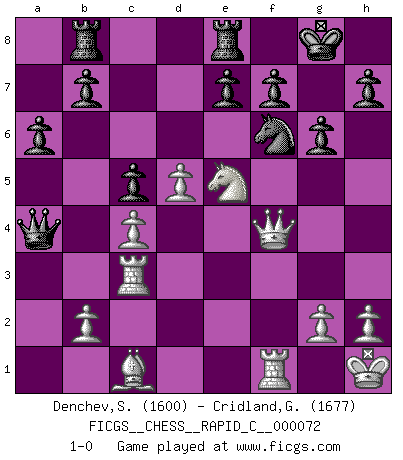 Last move : 1-0 2009 May 12 1:2:34 [Event "FICGS__CHESS__RAPID_C__000072"] [Site "FICGS"] [Date "2009.04.07"] [Round "1"] [White "Denchev,Stanimir"] [Black "Cridland,Graham"] [Result "1-0"] [WhiteElo "1600"] [BlackElo "1677"] 1.d4 Nf6 2.Nf3 c5 3.d5 g6 4.c4 Bg7 5.Nc3 O-O 6.e4 d6 7.Be2 a6 8.O-O Bg4 9.Ne1 Bxe2 10.Qxe2 Nbd7 11.f4 Rb8 12.a4 Qa5 13.Ra3 Rfe8 14.e5 dxe5 15.fxe5 Nxe5 16.Qxe5 Ng4 17.Qf4 Bd4+ 18.Kh1 Nf6 19.Nf3 Bxc3 20.Rxc3 Qxa4 21.Ne5 1-0 Queen's pawn game Kingside Castling by player Black (move 5) Kingside Castling by player White (move 8) Player White won this chess game. Follow this game move after move (download)We cannot resist the fascination of sacrifice, since a passion for sacrifices is part of a Chessplayer's nature. (Rudolf Spielman) Auf Remis zu spielen ist gewissermaßen ein Verbrechen gegen das Schachspiel. (Mikhail Nekhemyevich Tal) La caracteristica mas importante en la posición del Ajedrez es la actividad de las piezas. Esto es absolutamente fundamental en todas las fases del juego: Apertura, Juego Medio y especialmente Finales. La limitación primordial en la actividad de una pieza, es la estructuración de los Peones. (Michael Stean) Le pion, dans sa simplicité, marche droit devant lui, mais lorsqu'il prend, il le fait obliquement? Ainsi l'homme, tant qu'il reste pauvre, marche dans la droiture et vit honnêtement, mais lorsqu'il recherche les honneurs, il flatte, se parjure et, par les voies obliques, cherche une position supérieure sur l'échiquier du monde. (Jean de Galles) Everybody lies. (Gregory House, House M.D.)
