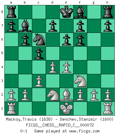 Last move : 0-1 2009 May 22 6:25:39 [Event "FICGS__CHESS__RAPID_C__000072"] [Site "FICGS"] [Date "2009.04.07"] [Round "1"] [White "Mackoy,Travis"] [Black "Denchev,Stanimir"] [Result "0-1"] [WhiteElo "1638"] [BlackElo "1600"] 1.e4 c5 2.Nf3 e6 3.d4 Nf6 4.Bg5 Qa5+ 5.Qd2 Qxd2+ 6.Nbxd2 Nc6 7.Bxf6 gxf6 8.c3 b6 9.Be2 Bb7 0-1 This chess game has been lost on time (started : 2009.04.07 19:22:41) Sicilian defense Player Black won this chess game. Follow this game move after move (download)A thorough understanding of the typical mating continuations makes the most complicated sacrificial combinations leading up to them not only not difficult, but almost a matter of course. (Siegbert Tarrasch) Es ist besser die Steine des Gegners zu opfern. (Savielly Grigorievitsch Tartakower) No hay precio que sea tan grande por la cabellera del Rey enemigo. (Koblentz) Les Echecs représentent une sphère d'idées créatrices basée sur la volonté des deux protagonistes. (Smyslov) The faster the computer, the slower the brain. (Thibault de Vassal)