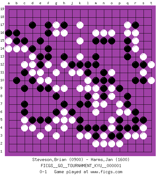 Last move : 0-1 2006 October 30 22:52:2 [Event "FICGS__GO__TOURNAMENT_KYU__000001"] [Site "FICGS"] [Date "2006.09.08"] [Round "1"] [Black "Steveson,Brian"] [White "Harms,Jan"] [Result "0-1"] [Rating 1 "0900"] [Rating 2 "1600"] 1.d17 d4 2.q4 q16 3.c15 k17 4.r10 k3 5.m3 r3 6.r4 q3 7.p3 p2 8.o3 o2 9.q7 s4 10.s5 s3 11.r5 m2 12.h17 k15 13.d10 r14 14.c7 c12 15.e12 e14 16.f13 c10 17.c9 d11 18.b10 e11 19.c11 d12 20.f11 e10 21.e9 f10 22.f9 g11 23.f14 f12 24.e13 c14 25.d14 n3 26.n4 n2 27.g4 e3 28.e5 c5 29.d5 c4 30.m4 g9 31.g8 o16 32.m15 m16 33.n15 n16 34.o15 k13 35.m13 g16 36.f16 g17 37.r12 g3 38.h13 h12 39.j12 j11 40.k12 k11 41.l12 h9 42.l11 k9 43.k5 l10 44.m10 m9 45.q13 n10 46.n11 m11 47.m12 o11 48.m10 o9 49.l8 l9 50.n8 m8 51.n9 n7 52.o10 o8 53.n10 m6 54.k7 p6 55.p5 q6 56.r6 p7 57.q8 o4 58.p4 o5 59.k4 l3 60.l4 f4 61.f5 h4 62.h5 g5 63.g6 j5 64.j6 h6 65.h7 h5 66.r17 q17 67.q15 r15 68.q14 r16 69.f17 h16 70.l7 m7 71.c6 d13 72.e15 b14 73.b15 a15 74.a16 a14 75.b16 s13 76.p9 s11 77.s12 t12 78.s10 t10 0-1 Here are the names of the openings (joseki) played in the four corners : Corner d4 : d4 c7 Hoshi (Hwajeom, Seongjeom, Xingwei`) 4-4 Point. The star or hoshi (4-4) point, emphasizing influence at the potential expense of territory. Nikken Kakari (Dukan Keolch'im, E`r Gua`jiao~, 2-Space Low Approach). White typically answers by 7-3 or 3-5 (which is not joseki). Player White won this Go (weiqi, baduk) game. Follow this game move after move (download)Six eyes in a rectangle are alive. (Anonymous) If you are going through hell, keep going. (Winston Churchill)