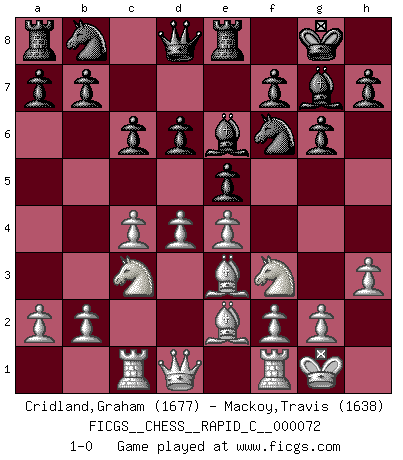 Last move : 1-0 2009 May 22 6:25:39 [Event "FICGS__CHESS__RAPID_C__000072"] [Site "FICGS"] [Date "2009.04.07"] [Round "1"] [White "Cridland,Graham"] [Black "Mackoy,Travis"] [Result "1-0"] [WhiteElo "1677"] [BlackElo "1638"] 1.e4 g6 2.d4 Bg7 3.Nf3 d6 4.c4 Nf6 5.Nc3 O-O 6.Be2 c6 7.O-O Re8 8.Be3 e5 9.Rc1 Be6 10.h3 1-0 This chess game has been lost on time (started : 2009.04.07 19:22:41) Robatsch (Modern) defense Kingside Castling by player Black (move 5) Kingside Castling by player White (move 7) Player White won this chess game. Follow this game move after move (download)A win by an unsound combination, however showy, fills me with artistic horror. (Wilhelm Steinitz) Wenn Dein Gegner dir ein Remis anbietet, versuch herauszufinden, weshalb er glaubt schlechter zu stehen. (Nigel Short) El Ajedrez es un regaderazo frío para la mente. (Sir John Simon) En blitz, le Cavalier l'emporte sur le Fou. (Vlastimil Hort) Children in the dark cause accidents, accidents in the dark cause children. (Unknown)