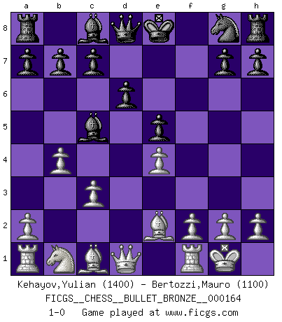 Last move : 1-0 2009 December 18 20:33:22 [Event "FICGS__CHESS__BULLET_BRONZE__000164"] [Site "FICGS"] [Date "2009.12.18"] [Round "1"] [White "Kehayov,Yulian"] [Black "Bertozzi,Mauro"] [Result "1-0"] [WhiteElo "1400"] [BlackElo "1100"] 1.e4 e5 2.Nf3 f6 3.d4 Nc6 4.dxe5 Bb4+ 5.c3 Bc5 6.Be2 Nxe5 7.O-O d6 8.Nxe5 fxe5 9.b4 1-0 This chess game has been lost on time (started : 2009.12.18 20:14:5) Damiano's defense Kingside Castling by player White (move 7) Player White won this chess game. Follow this game move after move (download)The most powerful weapon in Chess is to have the next move. (David Bronstein) Mein Gehirn das ist mein zweitwichtigstes Organ [Aus dem Film: Der Schläfer]. (Woody Allen) No nos podemos resistir a la fascinación de un sacrificio ya que la pasión por los sacrificios es parte de la naturaleza de un jugador de Ajedrez. (Rudolf Spielman) Les échecs sont un jeu terrible. Si vous n'avez pas le centre, votre adversaire a une position plus libre. Par contre, si vous avez le centre, alors vous avez vraiment quelque chose pour laquelle vous inquiéter ! (Siegbert Tarrasch) Wikichess, chess moves explained by 'experimented' players. (Thibault de Vassal)