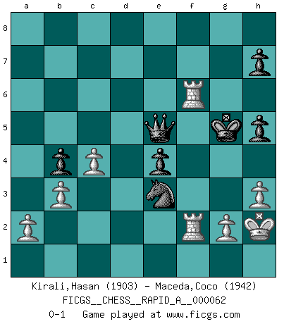 Last move : 0-1 2009 August 1 12:6:48 [Event "FICGS__CHESS__RAPID_A__000062"] [Site "FICGS"] [Date "2009.04.09"] [Round "1"] [White "Kirali,Hasan"] [Black "Maceda,Coco"] [Result "0-1"] [WhiteElo "1903"] [BlackElo "1942"] 1.e4 c5 2.Nf3 d6 3.d4 cxd4 4.Nxd4 a6 5.c4 Nf6 6.Nc3 e5 7.Nf3 Be7 8.h3 O-O 9.Be2 b5 10.Bg5 b4 11.Nd5 Nbd7 12.Be3 Nxe4 13.Nxe7+ Qxe7 14.Qd5 Ndc5 15.Qxa8 Bb7 16.Qa7 Qc7 17.O-O Ra8 18.Qxa8+ Bxa8 19.Rfd1 f5 20.Nd2 f4 21.Nxe4 fxe3 22.Nxd6 exf2+ 23.Kxf2 Ne6 24.Nf5 Qc5+ 25.Ne3 Nd4 26.Rd2 Nf5 27.Rd8+ Kf7 28.Bh5+ g6 29.Re1 gxh5 30.Rxa8 Qd4 31.Re2 Kg7 32.b3 Qf4+ 33.Kg1 Nxe3 34.Ra7+ Kg6 35.Rxa6+ Kg5 36.Rf2 Qd4 37.Raf6 e4 38.Kh2 Qe5+ 0-1 This chess game has been lost on time (started : 2009.04.09 19:15:30) Sicilian Kingside Castling by player Black (move 8) Kingside Castling by player White (move 17) Player Black won this chess game. Follow this game move after move (download)The combination player thinks forward; he starts from the given position, and tries the forceful moves in his mind. (Emanuel Lasker) Ich las kürzlich ein Buch von Nietzsche. Er sagte Religion verdumme nur die Menschen. Ich stimme zu. (Robert James Fischer) Cuando le juegas a Fischer, no es una cuestion de si vas a ganar o perder. Es una cuestion de si vas a sobrevivir. (Boris Spassky) L'attaque fait le spectacle, la défense gagne les matchs. (Dicton footballistique) A specialist learns more and more about less and less until he knows everything about nothing. (Nicholas Murray Butler)