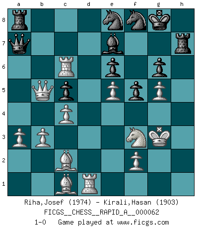 Last move : 1-0 2009 June 27 20:58:15 [Event "FICGS__CHESS__RAPID_A__000062"] [Site "FICGS"] [Date "2009.04.09"] [Round "1"] [White "Riha,Josef"] [Black "Kirali,Hasan"] [Result "1-0"] [WhiteElo "1974"] [BlackElo "1903"] 1.d4 Nf6 2.c4 e6 3.Nf3 Bb4+ 4.Nbd2 b6 5.a3 Be7 6.e4 d6 7.Bd3 Bb7 8.O-O O-O 9.Qe2 Nbd7 10.e5 dxe5 11.dxe5 Ne8 12.Bc2 c5 13.Ne4 Qc7 14.Bf4 g6 15.Qe3 Rd8 16.Rad1 Bxe4 17.Qxe4 Ng7 18.g4 a6 19.Ba4 Nb8 20.Rfe1 h5 21.h3 Kh7 22.Bd2 Kg8 23.Kg2 Qc8 24.Re3 Qc7 25.Rb3 Kh8 26.Rg1 Nd7 27.Re1 Kh7 28.Qc6 Qa7 29.Re2 a5 30.Be3 Qb8 31.Bf4 hxg4 32.hxg4 f5 33.g5 Rf7 34.Re1 Nh5 35.Rh1 Nf8 36.Rxb6 Qa7 37.Ra6 Qb8 38.Qb5 Kg8 39.Bc1 Qc7 40.Qxa5 Qb7 41.Rc6 Ra8 42.Qb5 Qa7 43.Bc2 Ng7 44.b3 Ne8 45.Rd1 Rh7 46.Kg3 1-0 This chess game has been lost on time (started : 2009.04.09 19:15:30) Bogo-Indian defense, Gruenfeld variation Kingside Castling by player White (move 8) Kingside Castling by player Black (move 8) Player White won this chess game. Follow this game move after move (download)Good offense and good defense both begin with good development. (Bruce A. Moon) Ich habe Kasparov in Rente geschickt. (Veselin Topalov) El Ajedrez por encima de todo... ¡es una pelea!. (Emanuel Lasker) Une platitude souvent récitée à propos des Echecs est qu'une des choses les plus difficiles à réaliser est de gagner une position gagnante. Cela ne manque pas de sens mais, pour ma part, j'ai toujours trouvé plus difficile de gagner une position perdante. (Tim Krabbe) Wipe them out. All of them. (Darth Sidious in Star Wars ep.1)