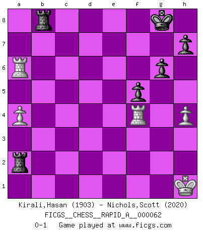 Last move : 0-1 2009 June 22 14:16:38 [Event "FICGS__CHESS__RAPID_A__000062"] [Site "FICGS"] [Date "2009.04.09"] [Round "1"] [White "Kirali,Hasan"] [Black "Nichols,Scott"] [Result "0-1"] [WhiteElo "1903"] [BlackElo "2020"] 1.e4 e5 2.Nf3 Nc6 3.d4 exd4 4.Nxd4 Bc5 5.Be3 Qf6 6.c3 a6 7.Be2 Nge7 8.O-O O-O 9.f4 d6 10.Qd3 Re8 11.Nd2 Nxd4 12.Bxd4 Bxd4+ 13.cxd4 Bd7 14.e5 Qh6 15.Qb3 dxe5 16.dxe5 Rad8 17.Rad1 Be6 18.Bc4 Bxc4 19.Qxc4 Qb6+ 20.Kh1 Nd5 21.Qc1 Nb4 22.Qb1 Nd3 23.Ne4 Qxb2 24.Qxb2 Nxb2 25.Rc1 Re7 26.Rb1 Nd3 27.Rxb7 Nxf4 28.Nc5 Rxe5 29.Rxc7 Re2 30.Nb7 Rf8 31.Nd6 Nxg2 32.Nf5 Ne3 33.Nxe3 Rxe3 34.a4 Ra3 35.Rf4 f5 36.h4 g6 37.Ra7 Rb8 38.Rxa6 Ra2 0-1 Scotch game Kingside Castling by player White (move 8) Kingside Castling by player Black (move 8) Player Black won this chess game. Follow this game move after move (download)Mistrust is the most necessary characteristic of the Chess player. (Siegbert Tarrasch) Über die Verhaftung Bobby Fischers: Warum es die Bush-Administration für nötig befindet einen 61 Jahre alten Mann zu hetzten, der für niemanden ausser sich selbste eine Gefahr darstellt ist ein Rätsel. (Nigel Short) Un Peón pasado aumenta su poder a medida de que el número de piezas en el tablero disminuye. (Capablanca) Dieu déplace le joueur, et celui-ci la pièce. Quel Dieu derrière Dieu commence donc la trame ? Arturo Perez-Reverte (prix de littérature policière 1993). Excelling at chess has long been considered a symbol of more general intelligence. That is an incorrect assumption in my view, as pleasant as it might be. But for the purposes of argument and investigation, chess is, in Russkin-Gutman's words, 'an unparalleled laboratory, since both the learning process and the degree of ability obtained can be objectified and quantified, providing an excellent comparative framework on which to use rigorous analytical techniques.' (The Chess Master and the Computer, by Garry Kasparov - 2010)