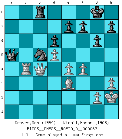 Last move : 1-0 2009 July 1 21:19:2 [Event "FICGS__CHESS__RAPID_A__000062"] [Site "FICGS"] [Date "2009.04.09"] [Round "1"] [White "Groves,Don"] [Black "Kirali,Hasan"] [Result "1-0"] [WhiteElo "1964"] [BlackElo "1903"] 1.d4 Nf6 2.Nf3 g6 3.c4 Bg7 4.Nc3 O-O 5.e4 d6 6.Be2 c5 7.d5 Bg4 8.Qc2 a6 9.O-O Nbd7 10.h3 Bxf3 11.Bxf3 Ne8 12.Rb1 Nc7 13.Be2 b5 14.cxb5 Nxb5 15.Nxb5 axb5 16.Bxb5 Rxa2 17.Qc4 Ra8 18.b4 cxb4 19.Rxb4 Rc8 20.Qe2 Rb8 21.Bg5 Bf6 22.Bh6 Bg7 23.Bd2 Nc5 24.Rfb1 Qa5 25.Qc4 Rb7 26.Be3 Be5 27.f4 Bc3 28.Qxc3 Rxb5 29.Qc4 Rxb4 30.Rxb4 Rc8 31.Kh2 1-0 This chess game has been lost on time (started : 2009.04.09 19:15:30) King's Indian : East Indian defense Kingside Castling by player Black (move 4) Kingside Castling by player White (move 9) Player White won this chess game. Follow this game move after move (download)Chess problems demand from the composer the same virtues that characterize all worthwhile art: originality, invention, conciseness, harmony, complexity, and splendid insincerity. (Vladimir Nabokov) Zu meiner Zeit war ein 20 jähriger ein junger Spieler, heute ist er ein Veteran. (Garry Kasparov) La caracteristica mas importante en la posición del Ajedrez es la actividad de las piezas. Esto es absolutamente fundamental en todas las fases del juego: Apertura, Juego Medio y especialmente Finales. La limitación primordial en la actividad de una pieza, es la estructuración de los Peones. (Michael Stean) Le thème de l'attaque double intervient d'une manière ou d'une autre dans l'immense majorité des combinaisons. (Youri Averbakh) Macintosh - we might not get everything right, but at least we knew the century was going to end. (Douglas Adams)