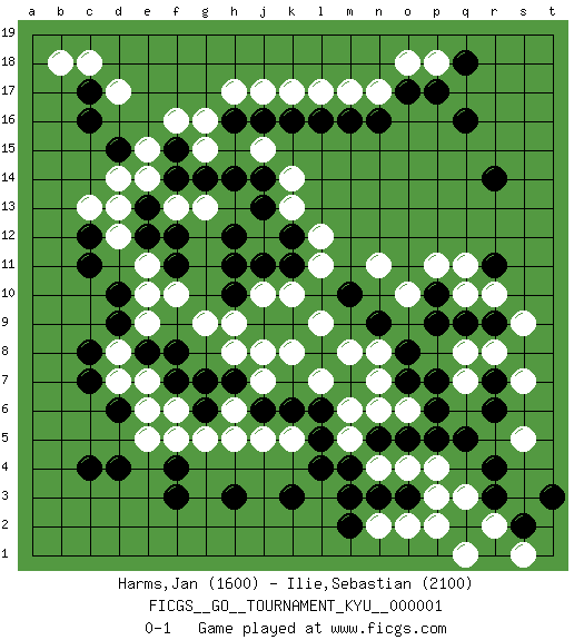 Last move : 0-1 2006 October 6 21:45:14 [Event "FICGS__GO__TOURNAMENT_KYU__000001"] [Site "FICGS"] [Date "2006.09.08"] [Round "1"] [Black "Harms,Jan"] [White "Ilie,Sebastian"] [Result "0-1"] [Rating 1 "1600"] [Rating 2 "2100"] 1.q16 d17 2.d4 q3 3.q5 q8 4.r3 r2 5.r4 p2 6.o3 p4 7.p5 o4 8.r7 r8 9.k3 s7 10.d15 d12 11.d10 f16 12.c17 c18 13.c16 b18 14.f15 g16 15.f12 e11 16.f11 e10 17.d9 f10 18.c4 d7 19.e8 e7 20.f8 g9 21.f7 e5 22.f3 f6 23.h7 h5 24.g6 g5 25.f4 f5 26.h3 k5 27.j9 j10 28.j6 j5 29.h10 h9 30.h11 j8 31.k9 h8 32.k6 k8 33.l5 h6 34.g7 j7 35.c12 c13 36.c11 d13 37.c7 d8 38.c8 e9 39.d6 e6 40.k16 g15 41.f14 l9 42.j11 k10 43.r14 k13 44.j13 k14 45.k12 l12 46.j14 j15 47.k11 l11 48.h12 g13 49.g14 f13 50.e13 e14 51.e12 e15 52.h14 d14 53.o17 m17 54.m16 l17 55.l16 n17 56.n16 o18 57.p17 p18 58.q18 k17 59.j16 j17 60.h16 h17 61.r11 p11 62.l4 n6 63.o7 o6 64.p9 q10 65.q9 r10 66.r9 s9 67.m7 m6 68.l6 l7 69.o5 n4 70.n5 m5 71.m4 n7 72.p6 n8 73.o8 q7 74.n9 m8 75.n3 p3 76.s2 s1 77.t3 n2 78.m2 o2 79.m3 q1 80.r6 s5 81.p7 o10 82.p10 q11 83.m10 n11 0-1 Here are the names of the openings (joseki) played in the four corners : Corner q4 : q3 q5 Komoku (Somok, Xiao~mu`) 3-4 Point. The komoku (3-4) point is the traditional corner enclosure move.. Ikken Takagakari (Hankan Nop'dakeolch'im, Yi Gaogua`jiao~, 1-Space High Approach). The 5-4 approach move has become more popular in modern times, as modern Go emphasizes speed and influence. Corner d16 : d17 d15 Komoku (Somok, Xiao~mu`) 3-4 Point. The komoku (3-4) point is the traditional corner enclosure move.. Ikken Takagakari (Hankan Nop'dakeolch'im, Yi Gaogua`jiao~, 1-Space High Approach). The 5-4 approach move has become more popular in modern times, as modern Go emphasizes speed and influence. Player White won this Go (weiqi, baduk) game. Follow this game move after move (download)Keep inessential ataris till the end. (Anonymous) Either move or be moved. (Ezra Pound)