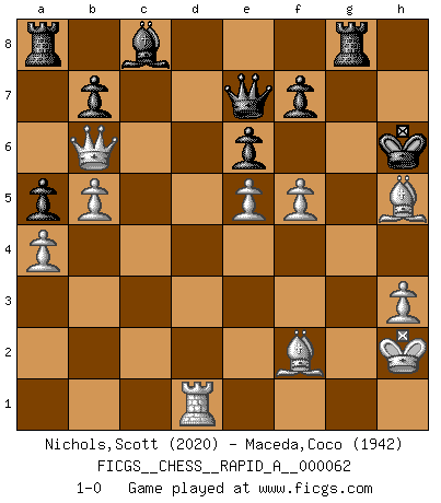 Last move : 1-0 2009 June 2 3:7:2 [Event "FICGS__CHESS__RAPID_A__000062"] [Site "FICGS"] [Date "2009.04.09"] [Round "1"] [White "Nichols,Scott"] [Black "Maceda,Coco"] [Result "1-0"] [WhiteElo "2020"] [BlackElo "1942"] 1.e4 c5 2.Nf3 d6 3.d4 cxd4 4.Nxd4 Nf6 5.Nc3 a6 6.Bc4 e6 7.a4 Be7 8.O-O O-O 9.Qe2 Nc6 10.Rd1 Nxd4 11.Rxd4 Bd7 12.Ba2 Qa5 13.b4 Qe5 14.Qd2 a5 15.f4 Qh5 16.b5 d5 17.Bb3 Rfe8 18.e5 Bc5 19.Ba3 Bxd4+ 20.Qxd4 Ng4 21.h3 Nh6 22.Qb6 Bc8 23.Bc5 Qh4 24.Rf1 Nf5 25.Ne2 Ng3 26.Nxg3 Qxg3 27.Be3 Qh4 28.Rd1 Qe7 29.Kh2 g6 30.g4 Kg7 31.Bc5 Qh4 32.c4 dxc4 33.Bxc4 Rg8 34.Be2 Re8 35.Kg2 h5 36.Bf2 Qe7 37.gxh5 gxh5 38.Bxh5 Rg8 39.Kh2 Kh6 40.f5 1-0 Sicilian : Najdorf, Lipnitzky attack Kingside Castling by player White (move 8) Kingside Castling by player Black (move 8) Player White won this chess game. Follow this game move after move (download)All my games are real. (Bobby Fischer) Als ich elf wurde, wurde ich einfach gut. (Robert James Fischer) El Ajedrez, como la música, como el amor, tiene el poder de hacer feliz a la gente. (Siegbert Tarrasch) Les échecs, c'est la lutte contre l'erreur. (Johannes Zukertort) Wisdom doesn't necessarily come with age. Sometimes age just shows up all by itself. (Tom Watson)