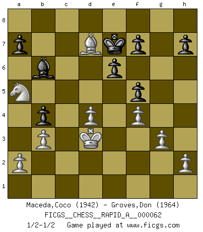 Last move : 1/2-1/2 2009 June 20 5:52:5 [Event "FICGS__CHESS__RAPID_A__000062"] [Site "FICGS"] [Date "2009.04.09"] [Round "1"] [White "Maceda,Coco"] [Black "Groves,Don"] [Result "1/2-1/2"] [WhiteElo "1942"] [BlackElo "1964"] 1.Nf3 Nf6 2.g3 d5 3.Bg2 c5 4.O-O Nc6 5.d4 e6 6.c4 dxc4 7.Qa4 Bd7 8.Qxc4 b5 9.Qd3 Rc8 10.dxc5 Bxc5 11.Nc3 Nb4 12.Qd1 Bc6 13.Qxd8+ Rxd8 14.Bg5 O-O 15.Rac1 Rc8 16.Bxf6 gxf6 17.Rfd1 Nd5 18.Ne4 Be7 19.Nd4 Bd7 20.Nd2 Nb6 21.N2b3 f5 22.e3 Rc4 23.Nd2 Rxc1 24.Rxc1 Bd6 25.N2b3 Rc8 26.Rxc8+ Nxc8 27.Na5 Kf8 28.f4 Bc5 29.Kf2 Nd6 30.Ke2 b4 31.b3 Nb5 32.Kd3 Nxd4 33.exd4 Bb6 34.Bc6 Ke7 35.Bxd7 1/2-1/2 Reti Opening Kingside Castling by player White (move 4) Kingside Castling by player Black (move 14) This chess game ended in a draw. Follow this game move after move (download)Chess is as much a mystery as women. (Purdy) Über Kasparov: Es ist offensichtlich, daß er in einem totalitären Staat aufwuchs und deshalb zu diktatorischen Zügen neigt. (Viktor Kortschnoi) La enorme capacidad mental, en la que sin ella no puede un jugador de Ajedrez existir, es demasiado requerida por el Ajedrez al grado de que nunca podrá liberar su mente de este juego. (Albert Einstein) Pour moi, les échecs ne sont pas un jeu mais un art. (Alexandre Alekhine) The difference between perseverance and obstinacy is that one comes from a strong will, and the other from a strong won't. (Henry Ward Beecher)