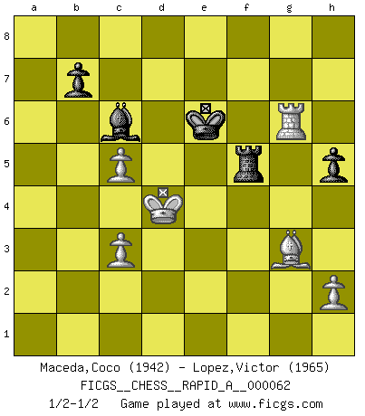 Last move : 1/2-1/2 2009 September 8 17:24:29 [Event "FICGS__CHESS__RAPID_A__000062"] [Site "FICGS"] [Date "2009.04.09"] [Round "1"] [White "Maceda,Coco"] [Black "Lopez,Victor"] [Result "1/2-1/2"] [WhiteElo "1942"] [BlackElo "1965"] 1.d4 Nf6 2.c4 g6 3.Nc3 d5 4.cxd5 Nxd5 5.e4 Nxc3 6.bxc3 Bg7 7.Bc4 c5 8.Ne2 Nc6 9.Be3 O-O 10.O-O Bd7 11.dxc5 Qc7 12.Nd4 Na5 13.Bb3 Rfd8 14.Qf3 Nxb3 15.axb3 e5 16.Nc2 a5 17.Qe2 Be6 18.Rfb1 Qd7 19.Ne1 a4 20.Rxa4 Rxa4 21.bxa4 Qxa4 22.f3 Rd7 23.Qb5 Qxb5 24.Rxb5 f5 25.Rb6 Kf7 26.exf5 Bxf5 27.Rb4 Bf6 28.Kf2 Bd8 29.g4 Bh4+ 30.Ke2 Bxe1 31.Kxe1 Be6 32.f4 Bxg4 33.fxe5 Bf5 34.Rb6 Re7 35.Kd2 Be4 36.Rf6+ Ke8 37.Bf4 Bf5 38.Rb6 Be4 39.Rd6 g5 40.Ke3 Bc6 41.Bg3 Kf8 42.Kd4 Rf7 43.Rd8+ Ke7 44.Rg8 h5 45.e6 Kxe6 46.Rxg5 Rf5 47.Rg6+ 1/2-1/2 King's Indian defense, 3.Nc3 Kingside Castling by player Black (move 9) Kingside Castling by player White (move 10) This chess game ended in a draw. Follow this game move after move (download)The boy (then a 12 year old boy named Anatoly Karpov) doesn't have a clue about Chess, and there's no future at all for him in this profession. (Mikhail Botvinnik) Das Schachspiel hat wie die Liebe, die Musik, die Fähigkeit, den Menschen glücklich zu machen. Ich habe ein leises Gefühl des Bedauerns für jeden, der das Schachspiel nicht kennt, so wie ich jeden bedaure, der die Liebe nicht kennt. (Siegbert Tarrasch) El Ajedrez es un regaderazo frío para la mente. (Sir John Simon) Même un GMI sait rarement calculer sur plus de cinq coups une attaque à sacrifices. (Rudolf Spielmann) This is where the fun begins. (Anakin Skywalker in Star Wars ep.3)