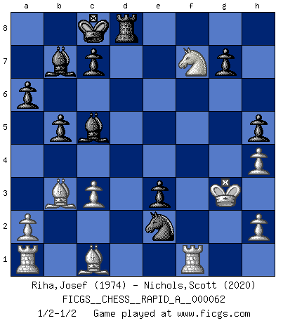 Last move : 1/2-1/2 2009 April 12 1:11:50 [Event "FICGS__CHESS__RAPID_A__000062"] [Site "FICGS"] [Date "2009.04.09"] [Round "1"] [White "Riha,Josef"] [Black "Nichols,Scott"] [Result "1/2-1/2"] [WhiteElo "1974"] [BlackElo "2020"] 1.e4 e5 2.Nf3 Nc6 3.Bb5 a6 4.Ba4 Nf6 5.O-O b5 6.Bb3 Bb7 7.c3 Nxe4 8.d4 exd4 9.Re1 d5 10.Ng5 Qf6 11.Nd2 Qxf2+ 12.Kh1 O-O-O 13.Ndxe4 dxe4 14.Rf1 Qh4 15.g3 dxc3 16.gxh4 Rxd1 17.Rxd1 Bc5 18.bxc3 e3 19.Kg2 Nd4 20.Kg3 Ne2+ 21.Kh3 h5 22.Rf1 Rd8 23.Nxf7 Nf4+ 24.Kg3 Ne2+ 1/2-1/2 Ruy Lopez : Archangelsk (counterthrust) variation Kingside Castling by player White (move 5) Queenside Castling by player Black (move 12) This chess game ended in a draw. Follow this game move after move (download)Checkers is for tramps. (Paul Morphy) Mutter, ich bin eben Ex-Weltmeister geworden. --beim nach Hause Kommen nach dem Verlust des WM-Titels an Mihail Botvinnik -- (Mikhail Nekhemyevich Tal) Hay dos clases de hombres: aquellos que se conforman en dejarse llevar por las circunstancias y que juegan barajas y aquellos decididos a controlar las circunstancias y que juegan al Ajedrez. (Mortimer Collins) Il (Jacob Murray) ne joue pas pour le bon coup, mais pour le meilleur. (Eloi Relange) We need strong personalities and only one world champion to attract sponsors. (Anatoly Karpov)