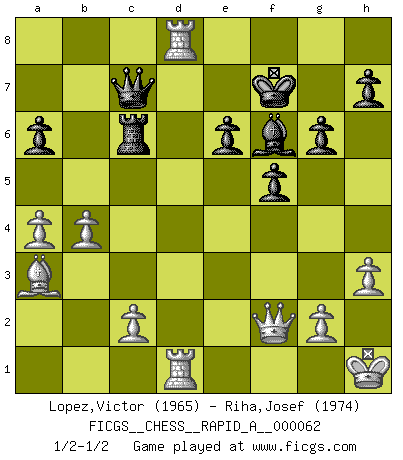 Last move : 1/2-1/2 2009 April 27 19:41:59 [Event "FICGS__CHESS__RAPID_A__000062"] [Site "FICGS"] [Date "2009.04.09"] [Round "1"] [White "Lopez,Victor"] [Black "Riha,Josef"] [Result "1/2-1/2"] [WhiteElo "1965"] [BlackElo "1974"] 1.e4 c5 2.Nf3 d6 3.d4 cxd4 4.Nxd4 Nf6 5.Nc3 Nc6 6.Bc4 Qb6 7.Nxc6 bxc6 8.O-O g6 9.Qe1 Ng4 10.h3 Ne5 11.Na4 Qc7 12.Qc3 Rg8 13.Be2 Bg7 14.f4 Nd7 15.Qe1 Bb7 16.Kh1 c5 17.Bf3 Rb8 18.Nc3 Ba6 19.Rf2 e6 20.a4 Bf6 21.Be2 Bxe2 22.Rxe2 a6 23.e5 dxe5 24.Qf2 Rb7 25.fxe5 Bxe5 26.Ne4 Rb6 27.Be3 f5 28.Nxc5 Nxc5 29.Bxc5 Rc6 30.Ba3 Kf7 31.Rd1 Bf6 32.b4 Rb8 33.Red2 Rd8 34.Rxd8 1/2-1/2 Sicilian : Sozin, Benko variation Kingside Castling by player White (move 8) This chess game ended in a draw. Follow this game move after move (download)When I asked Fischer why he had not played a certain move in our game, he replied: 'Well, you laughed when I wrote it down !' (Mikhail Tal) Ich spiele ehrlich und spiele, um zu gewinnen. Wenn ich verliere nehme ich meine Medizin. (Robert James Fischer) Un Peón pasado es un criminal, quién debe ser mantenido bajo candado y llave. Leves medidas, tales como vigilancia policiaca, no son suficientes. (Aaron Nimzovich) Nous sommes les pions de la mystérieuse partie d'Echecs jouée par Dieu. Il nous déplace, nous arrête, nous pousse encore, puis nous lance un à un dans la boîte du Néant. Epitaphe sur la tombe de David Janowsky (1868-1927). Hardware: the parts of a computer that can be kicked. (Jeff Persis)