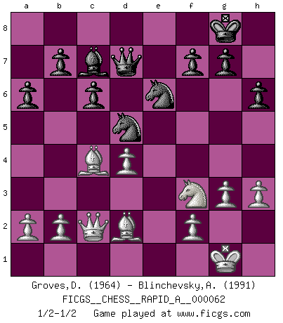 Last move : 1/2-1/2 2009 May 9 8:29:24 [Event "FICGS__CHESS__RAPID_A__000062"] [Site "FICGS"] [Date "2009.04.09"] [Round "1"] [White "Groves,Don"] [Black "Blinchevsky,Alexander"] [Result "1/2-1/2"] [WhiteElo "1964"] [BlackElo "1991"] 1.d4 Nf6 2.Nf3 d5 3.c4 c6 4.e3 e6 5.Nc3 Nbd7 6.Qc2 Bd6 7.Bd3 O-O 8.O-O dxc4 9.Bxc4 a6 10.Bd3 e5 11.Bd2 h6 12.Rfe1 Re8 13.Rad1 exd4 14.exd4 Rxe1+ 15.Rxe1 Nf8 16.h3 Be6 17.Na4 Qc7 18.Nc5 Re8 19.Nxe6 Rxe6 20.Bc4 Rxe1+ 21.Bxe1 Ne6 22.g3 Qd7 23.Bc3 Nd5 24.Bd2 Bc7 1/2-1/2 Queen's pawn game Kingside Castling by player Black (move 7) Kingside Castling by player White (move 8) This chess game ended in a draw. Follow this game move after move (download)In complicated positions, Bobby Fischer hardly had to be afraid of anybody. (Paul Keres) Im Blitz ist es einfacher mit einer Figur weniger anzugreifen, als sich mit einer Mehrfigur zu verteidigen. (Mikhail Nekhemyevich Tal) El Ajedrez, como cualquier otra actividad creativa, puede existir solo a través de méritos combinados de aquellos que tienen talento creativo y de aquellos que tienen la habilidad de organizar un trabajo creativo. (Mikhail Botvinnik) Le plus grand jeu de l'esprit jamais inventé, plus vous l'apprenez, plus vous y prenez du plaisir. (Garry Kasparov) Bobby never cared about money, though. His only desire was to prove that his choices were correct: He wanted chess to be important because he was a chess player, and he wanted to be important. Bobby knew money was important, but he didn't have a clue why, outside of clothes and status. The only way he could accomplish what he wanted was to fight for a lot of money. Once he got it, he gave it away. He did not know how to spend it. And once he'd become champion, after, essentially, sacrificing his life for it, he didn't know how to spend his time. (Bob Wade)