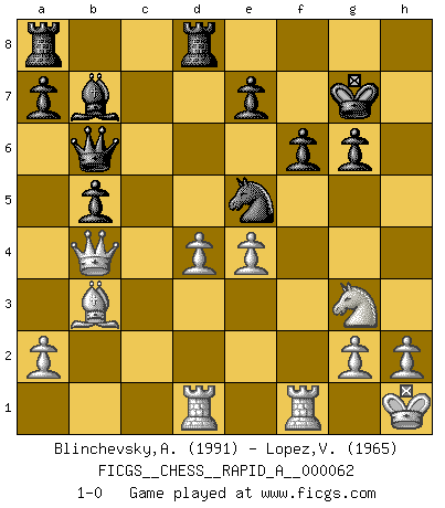 Last move : 1-0 2009 June 30 21:17:30 [Event "FICGS__CHESS__RAPID_A__000062"] [Site "FICGS"] [Date "2009.04.09"] [Round "1"] [White "Blinchevsky,Alexander"] [Black "Lopez,Victor"] [Result "1-0"] [WhiteElo "1991"] [BlackElo "1965"] 1.d4 Nf6 2.c4 g6 3.Nc3 d5 4.cxd5 Nxd5 5.e4 Nxc3 6.bxc3 Bg7 7.Bc4 c5 8.Ne2 Nc6 9.Be3 O-O 10.O-O Qc7 11.Rc1 Rd8 12.Bf4 Be5 13.Bxe5 Nxe5 14.Bb3 b5 15.Qd2 Ng4 16.f4 Bb7 17.Ng3 cxd4 18.cxd4 Qb6 19.Rcd1 Kg7 20.f5 f6 21.Kh1 Ne5 22.fxg6 hxg6 23.Qb4 1-0 This chess game has been lost on time (started : 2009.04.09 19:15:30) King's Indian defense, 3.Nc3 Kingside Castling by player Black (move 9) Kingside Castling by player White (move 10) Player White won this chess game. Follow this game move after move (download)War is the child of passion, passion is the child of narcissism and narcissism is the child. (...) Another game ? (Thibault de Vassal) Wenn Spassky eine Figur opfert kannst du genauso gut aufgeben. Aber wenn Tal eine Figur opfert, spiel weiter. Er könnte noch eine weitere opfern, und dann ... wer weiß? (Miguel Najdorf) Yo tuve un dolor de muelas en la primer partida. En el segundo juego, tuve un dolor de cabeza. En el tercero, tuve un ataque de reumatísmo. En la cuarta partida, no me sentía muy bien. ¿Y en el quinto juego? Bueno, ¿que acaso uno tiene que ganar todos los juegos?. (Siegbert Tarrasch) L'attaque fait le spectacle, la défense gagne les matchs. (Dicton footballistique) A generalist learns less and less about more and more until he knows nothing about everything. (Author unknown)