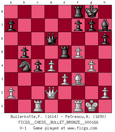 Last move : 0-1 2009 December 20 15:26:32 [Event "FICGS__CHESS__BULLET_BRONZE__000166"] [Site "FICGS"] [Date "2009.12.20"] [Round "1"] [White "Bullerkotte,Frank"] [Black "Petrescu,Horatiu Adrian"] [Result "0-1"] [WhiteElo "1614"] [BlackElo "1690"] 1.d4 Nf6 2.c4 e6 3.Nc3 d5 4.Bg5 Be7 5.e3 h6 6.Bh4 O-O 7.Nf3 b6 8.cxd5 Nxd5 9.Bxe7 Qxe7 10.Nxd5 exd5 11.Qd2 Bf5 12.Rc1 Qd6 13.Be2 c5 14.O-O c4 15.Ne5 Nc6 16.f4 Rae8 17.Bf3 Nb4 18.b3 b5 19.g4 Bh7 20.bxc4 dxc4 21.f5 Rxe5 0-1 Queen's pawn game Kingside Castling by player Black (move 6) Kingside Castling by player White (move 14) Player Black won this chess game. Follow this game move after move (download)Don't even mention losing to me. I can't stand to think of it. (Bobby Fischer) Um dein Spiel zu verbessern musst du zuallererst das Endspiel studieren, denn diese kann unabhängig studiert werden. Die Eröffnung und das Mittelspiel müssen immer in Bezug gesetzt werden zum Endspiel. (José Raúl Capablanca) Ciertamente el estado mental actual de Bobby Fischer es una tragedia. Uno de los mas grandes jugadores de Ajedrez del mundo -el orgullo y pena del Ajedrez Americano. (Frank Brady) Dieu déplace le joueur, et celui-ci la pièce. Quel Dieu derrière Dieu commence donc la trame ? Arturo Perez-Reverte (prix de littérature policière 1993). Only sick music makes money today. (Friedrich Nietzsche)