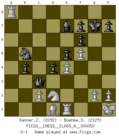 Last move : 0-1 2009 November 30 18:38:3 [Event "FICGS__CHESS__CLASS_A__000050"] [Site "FICGS"] [Date "2009.04.10"] [Round "1"] [White "Sanner,Zdzislaw"] [Black "Boehme,Sebastian"] [Result "0-1"] [WhiteElo "2092"] [BlackElo "2129"] 1.e4 c5 2.Nf3 d6 3.d4 cxd4 4.Nxd4 Nf6 5.Nc3 a6 6.Bg5 e6 7.f4 Qb6 8.Qd2 Qxb2 9.Nb3 Nbd7 10.Bxf6 gxf6 11.Be2 b5 12.O-O Bb7 13.Rab1 Qa3 14.f5 e5 15.Nd5 Rc8 16.Bh5 Be7 17.Kh1 Qxa2 18.Nb4 Qa3 19.Nd5 Nc5 20.Bf3 Na4 21.Na5 Bxd5 22.Qxd5 Nc3 23.Qb7 Qc5 24.Ra1 Qc7 25.Qxa6 O-O 26.Nb3 d5 27.Nd2 d4 28.Rfe1 Ra8 29.Qxa8 Rxa8 30.Rxa8+ Kg7 31.Nf1 b4 32.Nd2 Nb5 33.Bd1 Qc3 0-1 Sicilian : Najdorf, 7...Qb6 Kingside Castling by player White (move 12) Kingside Castling by player Black (move 25) Player Black won this chess game. Follow this game move after move (download)I played Chess with him and would have beaten him sometimes only he always took back his last move, and ran the game out differently. (Mark Twain) Im Schach nämlich geht es darum, daß Ich des Gegners klein zu kriegen, sein Ego zu zerbrechen und zu zermahlen, seine Selbstachtung zu zertreten und zu verscharren und seine ganze mißachtenswerte sogenannte Persönlichkeit ein für alle Mal tot zu hacken und zu zerstampfen und dadurch die menschliche Gesellschaft von einer stinkenden Pestbeule zu befreien. Es ist ein königliches Spiel. (Robert James Fischer) ¿Se han dado cuenta de que Fischer casi nunca ha tenido piezas malas? El las intercambia y las piezas malas se quedan con sus oponenets. (Yuri Balashov) Votre seul travail dans les ouvertures est d'obtenir un milieu de partie jouable. (Lajos Portish) A proverb is a short sentence based on long experience. (Miguel de Cervantes)