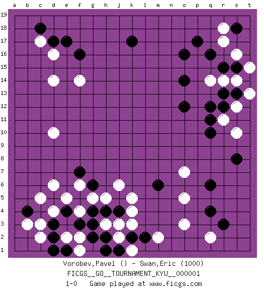 Last move : 1-0 2006 December 14 18:26:57 [Event "FICGS__GO__TOURNAMENT_KYU__000001 "] [Site "FICGS"] [Date "2006.09.08"] [Round "1"] [Black "Vorobev,Pavel "] [White "Swan,Eric "] [Result "1-0"] [Rating 2 "1000"] 1.q16 d4 2.q4 d16 3.q10 o3 4.q6 k4 5.k17 d10 6.g4 d6 7.f3 h3 8.h4 j3 9.d3 c3 10.e4 c5 11.b4 b3 12.d2 r14 13.r15 q14 14.o16 s10 15.r12 s12 16.s13 r11 17.q12 s14 18.s8 s16 19.r13 t13 20.s18 r17 21.q11 r18 22.f16 d14 23.d17 c17 24.e17 q2 25.p17 o5 26.o14 f14 27.s15 t15 28.o12 f6 29.r3 j6 30.g2 c2 31.f5 e5 32.h2 j2 33.j1 k1 34.h1 e2 35.e1 f1 36.d1 f2 37.g3 g5 38.g6 h5 39.j4 k5 40.k2 k3 41.m6 o7 42.l2 m2 43.f7 f4 44.c18 1-0 This go game has been lost on time (started : 2006.09.08 3:5:56) Here are the names of the openings (joseki) played in the four corners : Corner q4 : q4 o3Hoshi (Hwajeom, Seongjeom, Xingwei`) 4-4 Point. The star or hoshi (4-4) point, emphasizing influence at the potential expense of territory.Ikken Kakari (Hankan Keolch'im, Yi Gua`jiao~, 1-Space Low Approach). White 2 is the standard approach move to the 4-4. Corner d4 : d4 g4Hoshi (Hwajeom, Seongjeom, Xingwei`) 4-4 Point. The star or hoshi (4-4) point, emphasizing influence at the potential expense of territory.Nikken Takagakari (Dukan Nop'dakeolch'im, E`r Gaojia, 2-Space High Approach). Black 2 is a light approach move. Rarely played in even games, Black 2 is typically employed in handicap games. White continues with 6-4 or 3-10. In Korean Sunjang Baduk White has a stone on 8-4. Corner q16 : q16 r14Hoshi (Hwajeom, Seongjeom, Xingwei`) 4-4 Point. The star or hoshi (4-4) point, emphasizing influence at the potential expense of territory.Ikken Kakari (Hankan Keolch'im, Yi Gua`jiao~, 1-Space Low Approach). White 2 is the standard approach move to the 4-4. Corner d16 : d16 f16Hoshi (Hwajeom, Seongjeom, Xingwei`) 4-4 Point. The star or hoshi (4-4) point, emphasizing influence at the potential expense of territory.Ikken Takagakari (Hankan Nop'dakeolch'im, Yi Gaojia, 1-Space High Approach). White typically responds at 6-4 or 3-10. White 4-10 is played when White finds play on the right side advantageous. White 4-8 or 3-8 may be played when White has support at top. Player Black won this Go (weiqi, baduk) game.Follow this game move after move (download ) Fighting must not be the key to go, it should be reserved as your last resource. (Zhong-Pu Liu, about Weiqi) If passion drives you, let reason holds the reins. (Benjamin Franklin)