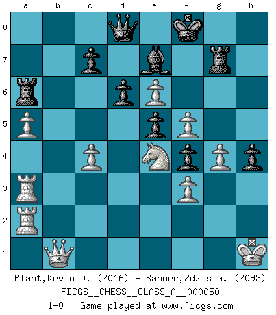 Last move : 1-0 2010 February 18 14:29:33 [Event "FICGS__CHESS__CLASS_A__000050"] [Site "FICGS"] [Date "2009.04.10"] [Round "1"] [White "Plant,Kevin D."] [Black "Sanner,Zdzislaw"] [Result "1-0"] [WhiteElo "2016"] [BlackElo "2092"] 1.d4 Nf6 2.c4 g6 3.Nc3 Bg7 4.e4 O-O 5.Nf3 d6 6.Be2 Nc6 7.O-O e5 8.d5 Ne7 9.Ne1 Nd7 10.f3 f5 11.Be3 f4 12.Bf2 g5 13.g4 fxg3 14.hxg3 Ng6 15.Ng2 h5 16.Ne3 h4 17.g4 Nf4 18.Nf5 a5 19.Be3 Nc5 20.Qc2 b6 21.Rfe1 Kf7 22.Bf1 Bd7 23.Rab1 Rh8 24.b3 Bf6 25.Nb5 Rb8 26.a3 a4 27.b4 Nb3 28.Bxf4 gxf4 29.Re2 Rh7 30.Rh2 Bg5 31.Rh3 Kg8 32.Bd3 Qf8 33.Qd1 Bf6 34.Bc2 Bxf5 35.exf5 Nd4 36.Bxa4 Ra8 37.Nc3 Rg7 38.Kh1 Qf7 39.Ne4 Kf8 40.Rc1 Ra7 41.Rc3 Bd8 42.Bb5 Kg8 43.a4 Qf8 44.Ra3 Be7 45.Bd7 Qd8 46.Be6+ Kf8 47.a5 Ra6 48.Rh2 bxa5 49.Rha2 Rb6 50.bxa5 Ra6 51.Qb1 Nxe6 52.dxe6 1-0 King's Indian : 4.e4 Kingside Castling by player Black (move 4) Kingside Castling by player White (move 7) Player White won this chess game. Follow this game move after move (download)Chess is the gymnasium of the mind. (Blaise Pascal) Obwohl ich vom Stil her kaum zu den Priestern der Schachkunst gezählt werde, halte ich Schach doch für eine Kunst. (Tigran Petrosjan) Durante una competencia de Ajedrez, un Maestro de Ajedrez deberá ser una combinación de presa de caza y un Monge. (Alexander Alekhine) La solitude du joueur d'Echecs à l'approche du mat est semblable à celle du condamné. (Francis Szpiner) Happy endings are just stories that haven't finished yet. (Jane Smith in Mr & Mrs Smith)