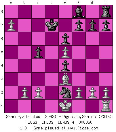 Last move : 1-0 2009 July 4 8:22:46 [Event "FICGS__CHESS__CLASS_A__000050"] [Site "FICGS"] [Date "2009.04.10"] [Round "1"] [White "Sanner,Zdzislaw"] [Black "Agustin,Santos"] [Result "1-0"] [WhiteElo "2092"] [BlackElo "2015"] 1.e4 e6 2.d4 d5 3.Nc3 Nf6 4.e5 Ne4 5.Nxe4 dxe4 6.Bc4 Qd7 7.Ne2 b5 8.Bb3 c5 9.a4 Nc6 10.axb5 Nxd4 11.Ba4 Qd5 12.Be3 Nxe2 13.b6 Bd7 14.Bxd7+ Qxd7 15.Qxd7+ Kxd7 16.Rxa7+ Rxa7 17.bxa7 1-0 French : Steinitz variation Player White won this chess game. Follow this game move after move (download)A man without frontiers. He didn't divide the East and the West, he brought them together in their admiration for him. (Ljubomir Ljubojevic, about Bobby Fischer's death) Ich organisiere ein großes Turnier, was mich etwa 120000 Dollar kostet. Ich denke, das ist das erste Mal in der Schachgeschichte, daß ein Schachgroßmeister auch als Mäzen auftritt. (Miguel Najdorf) Una victoria por una combinación errónea, aunque sea espectacular, me llena de horror artístico. (Wilhelm Steinitz) Les échecs, c'est la lutte contre l'erreur. (Johannes Zukertort) Life is verb, not a noun. (Charlotte Perkins Gilman)
