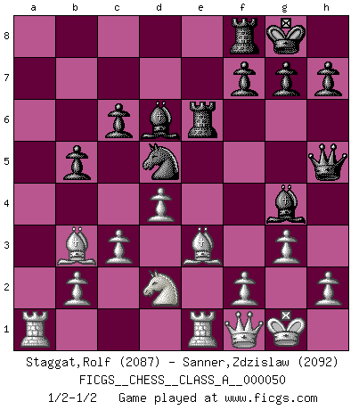 Last move : 1/2-1/2 2009 October 5 12:15:25 [Event "FICGS__CHESS__CLASS_A__000050"] [Site "FICGS"] [Date "2009.04.10"] [Round "1"] [White "Staggat,Rolf"] [Black "Sanner,Zdzislaw"] [Result "1/2-1/2"] [WhiteElo "2087"] [BlackElo "2092"] 1.e4 e5 2.Nf3 Nc6 3.Bb5 a6 4.Ba4 Nf6 5.O-O b5 6.Bb3 Be7 7.Re1 O-O 8.c3 d5 9.exd5 Nxd5 10.Nxe5 Nxe5 11.Rxe5 c6 12.d4 Bd6 13.Re1 Qh4 14.g3 Qh3 15.Be3 Bg4 16.Qd3 Rae8 17.Nd2 Re6 18.a4 Qh5 19.axb5 axb5 20.Qf1 Bh3 21.Qe2 Bg4 22.Qf1 Bh3 23.Qe2 Bg4 24.Qf1 1/2-1/2 Ruy Lopez : 5.O-O Kingside Castling by player White (move 5) Kingside Castling by player Black (move 7) This chess game ended in a draw. Follow this game move after move (download)There is no remorse like the remorse of Chess. (H. G. Wells) Ich verstehe Aljechins Kombinationen ganz gut; aber woher er diese Angriffschancen bekommt und wie er die Eröffnung behandelt das ist für mich ein Buch mit sieben Siegeln. (Rudolf Spielmann) El ganar no lo es todo... pero el perder es nada. (Mednis) Les échecs sont un jeu par leur forme, un art par leur essence et une science par sa difficulté d'acquisition. Ils peuvent vous procurer autant de plaisir qu'un bon livre ou une belle musique, mais vous n'aurez une réelle joie que si vous arrivez à bien jouer. (Tigran Petrosian) Wisdom begins at the end. (Daniel Webster)