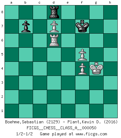 Last move : 1/2-1/2 2010 March 12 9:31:41 [Event "FICGS__CHESS__CLASS_A__000050"] [Site "FICGS"] [Date "2009.04.10"] [Round "1"] [White "Boehme,Sebastian"] [Black "Plant,Kevin D."] [Result "1/2-1/2"] [WhiteElo "2129"] [BlackElo "2016"] 1.e4 c5 2.Nf3 d6 3.d4 cxd4 4.Nxd4 Nf6 5.Nc3 e6 6.g4 h6 7.h4 e5 8.Nf5 Nc6 9.Bg2 g6 10.Ne3 Be6 11.Ncd5 Bg7 12.h5 Qd7 13.hxg6 fxg6 14.Nxf6+ Bxf6 15.Nd5 Bg7 16.Rxh6 O-O-O 17.Rxh8 Rxh8 18.f3 Rh2 19.Kf2 Qd8 20.c3 Ne7 21.Bg5 Bxd5 22.exd5 Bh6 23.Bxh6 Rxh6 24.Qd2 Rh7 25.c4 g5 26.Qxg5 Qb6+ 27.Kg3 Qxb2 28.Rd1 Qxa2 29.c5 Qa4 30.Rb1 Qf4+ 31.Qxf4 exf4+ 32.Kxf4 Kc7 33.Rd1 a5 34.Kg5 a4 35.f4 Rg7+ 36.Kh4 a3 37.cxd6+ Kxd6 38.Ra1 Nf5+ 39.gxf5 Rxg2 40.Rxa3 Ke7 41.Rd3 Kf6 42.d6 Rg8 43.Rd5 Rb8 44.d7 Rd8 45.Kg4 Kf7 46.Rd6 1/2-1/2 Sicilian : Scheveningen, Keres attack Queenside Castling by player Black (move 16) 10 pieces endgame at move 39 : White KRBPPP , Black KRPP WHITE : King + 1 Rook 1 Bishop 3 Pawns BLACK : King + 1 Rook 2 Pawns 9 pieces endgame at move 39 : White KRPPP , Black KRPP WHITE : King + 1 Rook 3 Pawns BLACK : King + 1 Rook 2 Pawns 8 pieces endgame at move 40 : White KRPPP , Black KRP WHITE : King + 1 Rook 3 Pawns BLACK : King + 1 Rook 1 Pawn This chess game ended in a draw. Follow this game move after move (download)The defensive power of a pinned piece is only imaginary. (Aaron Nimzovich) Ich hatte meine größten Erfolge, als ich 47 Jahre alt war. Kasparow war noch nicht mal 42 und hat das Schach schon im Stich gelassen. (Viktor Kortschnoi) Bobby es la celebridad menos entendida y malinterpretada que camina el la faz de esta tierra. (Yasser Seirawan) Les Echecs, c'est l'art de la guerre sans les charniers, c'est la résurrection des morts tombés au champ d'honneur, l'espoir perpétuel, la suprématie de l'intelligence sur la force, la culture de l'esprit. (F. Szpiner) When a man with money meets a man with experience, the man with experience leaves with money and the man with money leaves with experience. (Anonymous)