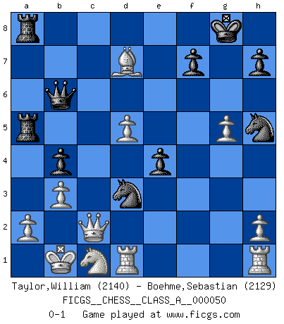 Last move : 0-1 2009 September 17 19:18:40 [Event "FICGS__CHESS__CLASS_A__000050"] [Site "FICGS"] [Date "2009.04.10"] [Round "1"] [White "Taylor,William"] [Black "Boehme,Sebastian"] [Result "0-1"] [WhiteElo "2140"] [BlackElo "2129"] 1.e4 c5 2.Nf3 d6 3.d4 cxd4 4.Nxd4 Nf6 5.Nc3 a6 6.Be3 e5 7.Nb3 Be6 8.f3 Be7 9.Qd2 O-O 10.O-O-O Nbd7 11.g4 b5 12.g5 b4 13.Ne2 Ne8 14.f4 a5 15.f5 Bxb3 16.cxb3 a4 17.bxa4 Rxa4 18.b3 Ra5 19.Kb1 d5 20.f6 Bc5 21.exd5 Qb6 22.Bxc5 Nxc5 23.fxg7 Nxg7 24.Qc2 e4 25.Bh3 Rfa8 26.Nc1 Nd3 27.Bd7 Nh5 0-1 Sicilian : Najdorf, Byrne (English) attack Kingside Castling by player Black (move 9) Queenside Castling by player White (move 10) Player Black won this chess game. Follow this game move after move (download)Your body has to be in top condition. Your Chess deteriorates as your body does. You can't separate body from mind. (Bobby Fischer) Wenn du gegen Bobby spielst, ist es keine Frage von gewinnen oder verlieren. Es ist eine Frage des Überlebens. (Boris Vassilievich Spassky) Vive, pierde y aprende al observar a tu oponente como ganar. (Amber Steenbock) Toutes choses étant égales, c'est la conviction qui gagne. Alliée à une volonté de vaincre, elle sert de détonateur, suscite des idées, disperse les doutes et aide à penser clairement. (Robert Fischer) Looking at the proliferation of personal web pages on the Net, it looks like very soon everyone on Earth will have 15 megabytes of fame. (M.G. Sriram)