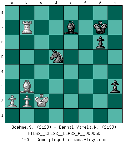 Last move : 1-0 2009 November 30 5:32:18 [Event "FICGS__CHESS__CLASS_A__000050"] [Site "FICGS"] [Date "2009.04.10"] [Round "1"] [White "Boehme,Sebastian"] [Black "Bernal Varela,Nelson"] [Result "1-0"] [WhiteElo "2129"] [BlackElo "2139"] 1.e4 c5 2.Nf3 d6 3.d4 cxd4 4.Nxd4 Nf6 5.Nc3 a6 6.f3 e5 7.Nb3 Be7 8.Be3 Be6 9.Qd2 Nbd7 10.g4 O-O 11.O-O-O b5 12.g5 Nh5 13.Nd5 Bxd5 14.exd5 Qc7 15.Kb1 Nb6 16.Na5 Nxd5 17.Qxd5 Qxa5 18.Bd3 Rac8 19.c4 Qd8 20.cxb5 axb5 21.h4 b4 22.Rhe1 g6 23.Ba6 Ra8 24.Bb7 Ra5 25.Qc6 Qe8 26.Qxe8 Rxe8 27.Bb6 Rb5 28.Bc6 Rxb6 29.Bxe8 Nf4 30.Ba4 Kg7 31.Bb3 f6 32.Rc1 Rb7 33.Rc6 d5 34.Rec1 fxg5 35.hxg5 Bxg5 36.Rc7+ Rxc7 37.Rxc7+ Kh6 38.Kc2 e4 39.fxe4 dxe4 40.Rc4 e3 41.Re4 Kg7 42.Rxe3 h5 43.Re4 h4 44.Rxb4 h3 45.Ba4 Nd5 46.Rb7+ Be7 47.Bb3 1-0 Sicilian : Najdorf Kingside Castling by player Black (move 10) Queenside Castling by player White (move 11) 10 pieces endgame at move 44 : White KRBPP , Black KBNPP WHITE : King + 1 Rook 1 Bishop 2 Pawns BLACK : King + 1 Bishop 1 Knight 2 Pawns Player White won this chess game. Follow this game move after move (download)There's never before been a Chess player with such a thorough knowledge of the intricacies of the game and such an absolutely indomitable will to win. I think Bobby is the greatest player that ever lived. (Lisa Lane) Besser ein falscher Plan, logisch durchgeführt, als gar kein Plan. (Viktor Kortschnoi) La partida mas dura de ganar es una partida ganada. (Emanuel Lasker) Il (Jacob Murray) ne joue pas pour le bon coup, mais pour le meilleur. (Eloi Relange) Two beer, or not two beer. (Unknown)