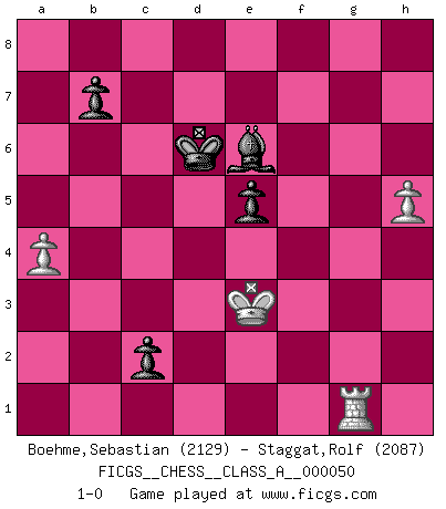 Last move : 1-0 2010 July 5 10:39:18 [Event "FICGS__CHESS__CLASS_A__000050"] [Site "FICGS"] [Date "2009.04.10"] [Round "1"] [White "Boehme,Sebastian"] [Black "Staggat,Rolf"] [Result "1-0"] [WhiteElo "2129"] [BlackElo "2087"] 1.e4 e5 2.Nf3 Nc6 3.Bb5 Nf6 4.O-O Nxe4 5.d4 Nd6 6.Bxc6 dxc6 7.dxe5 Nf5 8.Qxd8+ Kxd8 9.Nc3 Ke8 10.Rd1 a5 11.b3 h6 12.Bb2 Bb4 13.Ne4 a4 14.h3 Be7 15.c4 Be6 16.g3 Rd8 17.Rxd8+ Kxd8 18.g4 Nh4 19.Nxh4 Bxh4 20.f4 g6 21.Rd1+ Kc8 22.Rf1 Rd8 23.f5 gxf5 24.gxf5 Bd7 25.e6 fxe6 26.f6 e5 27.Ba3 c5 28.Bxc5 Bc6 29.f7 Bxe4 30.f8Q Rxf8 31.Rxf8+ Kd7 32.Rf7+ Kc8 33.bxa4 Bg5 34.Kf2 Bd3 35.Be7 Bxc4 36.Rf8+ Kd7 37.Bxg5 hxg5 38.Kg3 Be6 39.Rf6 Kd6 40.Rg6 c5 41.Rxg5 c4 42.h4 c3 43.Kf3 Bxa2 44.h5 c2 45.Rg1 Be6 46.Ke3 1-0 Ruy Lopez : Berlin defense, Open variation Kingside Castling by player White (move 4) Promotion Queen by player White (move 30) 10 pieces endgame at move 41 : White KRPPP , Black KBPPP WHITE : King + 1 Rook 3 Pawns BLACK : King + 1 Bishop 3 Pawns 9 pieces endgame at move 43 : White KRPP , Black KBPPP WHITE : King + 1 Rook 2 Pawns BLACK : King + 1 Bishop 3 Pawns Player White won this chess game. Follow this game move after move (download)When in doubt... play Chess ! (Tevis) Zum Sieg gelangt man nicht, wenn man gut, sondern nur wenn man besser spielt (Savielly Grigorievitsch Tartakower) Si pudieramos observar el interior de la cabeza de un jugador de Ajedrez, encontraríamos ahí un mundo lleno de sentimientos, imágenes, ideas, emoción y pasión. (Alfred Binet) La vérité est comme le meilleur coup aux échecs : elle existe, mais il faut la chercher. (Arturo Perez-Reverte) Better than a thousand days of diligent study is one day with a great teacher. (Japanese proverb)