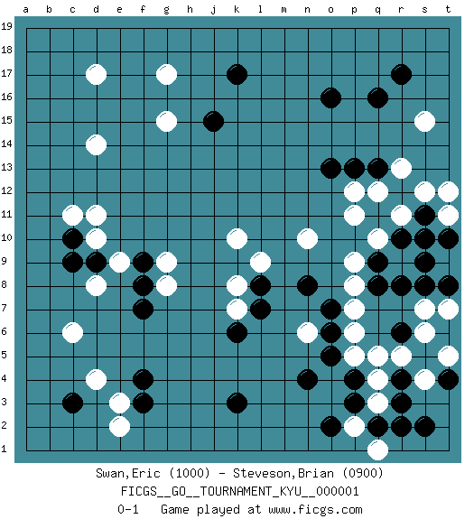 Last move : 0-1 2006 December 19 0:56:21 [Event "FICGS__GO__TOURNAMENT_KYU__000001"] [Site "FICGS"] [Date "2006.09.08"] [Round "1"] [Black "Swan,Eric"] [White "Steveson,Brian"] [Result "0-1"] [Rating 1 "1000"] [Rating 2 "0900"] 1.q16 d17 2.r4 d4 3.f3 e3 4.f4 c6 5.k3 q10 6.p4 d11 7.r8 r13 8.o16 d14 9.k17 s15 10.r17 g17 11.j15 r9 12.q8 g15 13.f7 n10 14.n8 q3 15.p3 q4 16.r3 q5 17.q2 p2 18.s2 p5 19.n4 n6 20.o5 r5 21.s5 p6 22.o6 p7 23.o7 p8 24.q9 p9 25.s9 p11 26.r10 r11 27.s11 s12 28.p13 p12 29.o13 s6 30.t4 s7 31.s8 t11 32.t10 s10 33.c3 e2 34.s11 t12 35.t8 s10 36.t6 t7 37.s11 q1 38.r2 s10 39.r6 t5 40.s11 d8 41.s10 s4 42.o2 k10 43.l8 l9 44.q13 k8 45.l7 k7 46.k6 q12 47.f9 g8 48.f8 g9 49.c10 d10 50.c9 c11 51.d9 e9 0-1 This go game has been lost on time (started : 2006.09.08 3:5:56) Here are the names of the openings (joseki) played in the four corners : Corner d4 : d4 f3 Hoshi (Hwajeom, Seongjeom, Xingwei`) 4-4 Point. The star or hoshi (4-4) point, emphasizing influence at the potential expense of territory. Ikken Kakari (Hankan Keolch'im, Yi Gua`jiao~, 1-Space Low Approach). Black 2 is the standard approach move to the 4-4. Corner q16 : q16 r13 Hoshi (Hwajeom, Seongjeom, Xingwei`) 4-4 Point. The star or hoshi (4-4) point, emphasizing influence at the potential expense of territory. Nikken Kakari (Dukan Keolch'im, E`r Gua`jiao~, 2-Space Low Approach). Black typically answers by 7-3 or 3-5 (which is not joseki). Player White won this Go (weiqi, baduk) game. Follow this game move after move (download)Connect with good shape. (Anonymous) Memory is a way of holding onto the things you love, the things you are, the things you never want to lose. (from the television show: The Wonder Years)